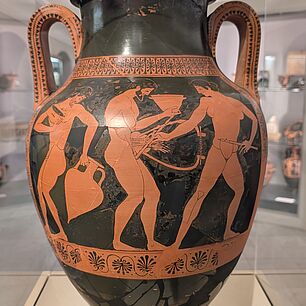 Ein weiterer Themenkomplex widmete sich dem Symposion. Die ausgestellten Darstellungen machten deutlich, dass diese geselligen Zusammenkünfte eine zentrale Rolle im kulturellen und intellektuellen Leben der griechischen Polis spielten. Musik, Gespräche, Spiele und Diskussionen standen dabei stets in engem Zusammenhang mit Bildungsanspruch und sozialem Austausch.