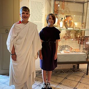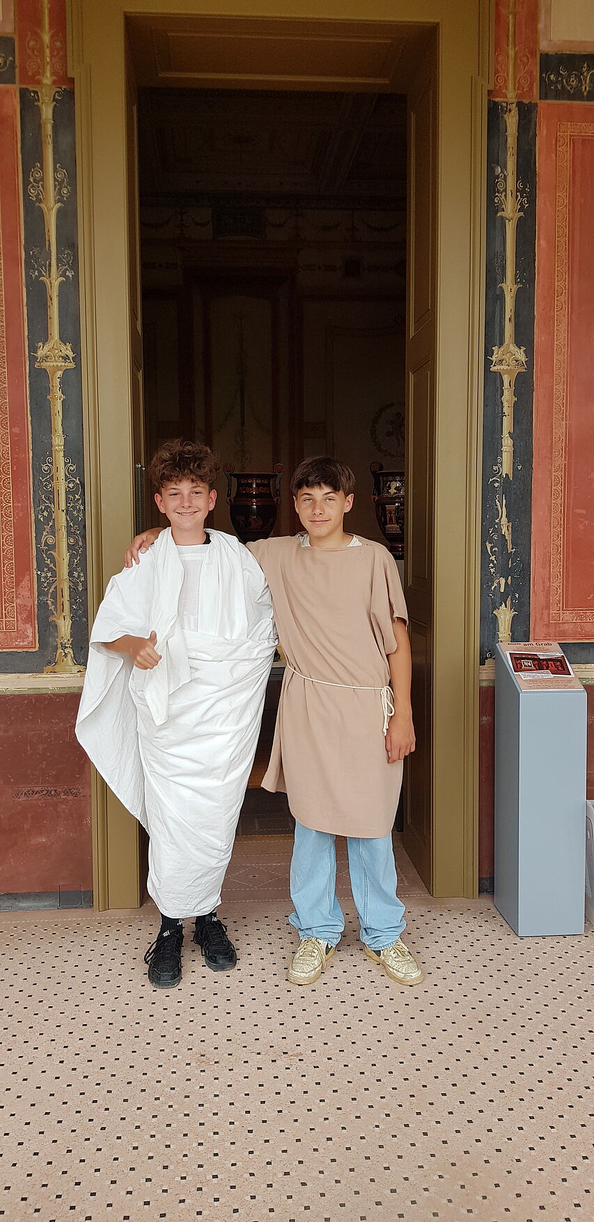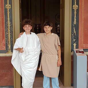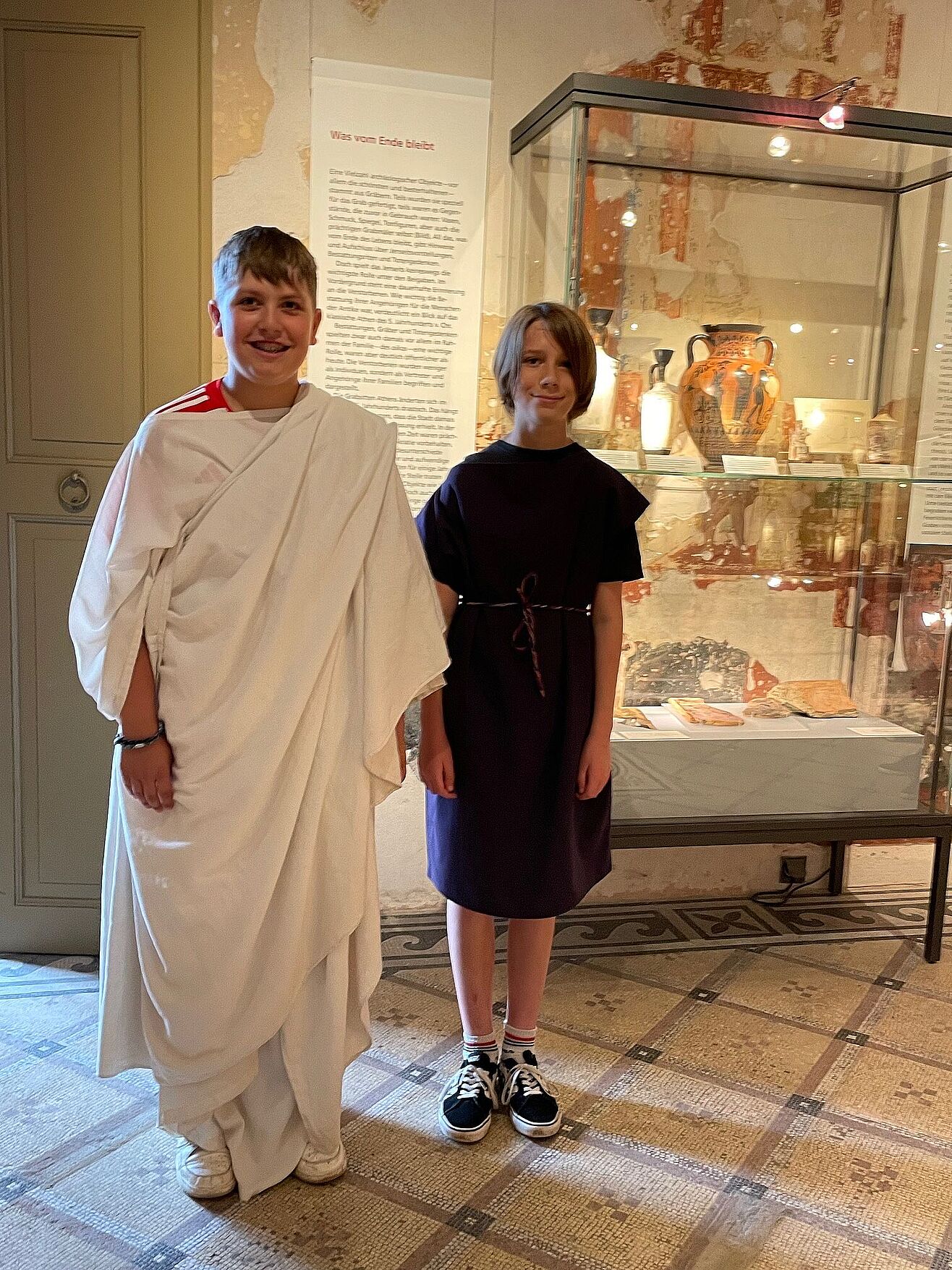 Bei unserer Führung durch die Villa hatten wir die Gelegenheit, den römischen Alltag eines Herrn und eines Sklaven nachzuspielen, wobei wir sogar wie ein römischer Herr bzw. Sklave eingekleidet wurden.