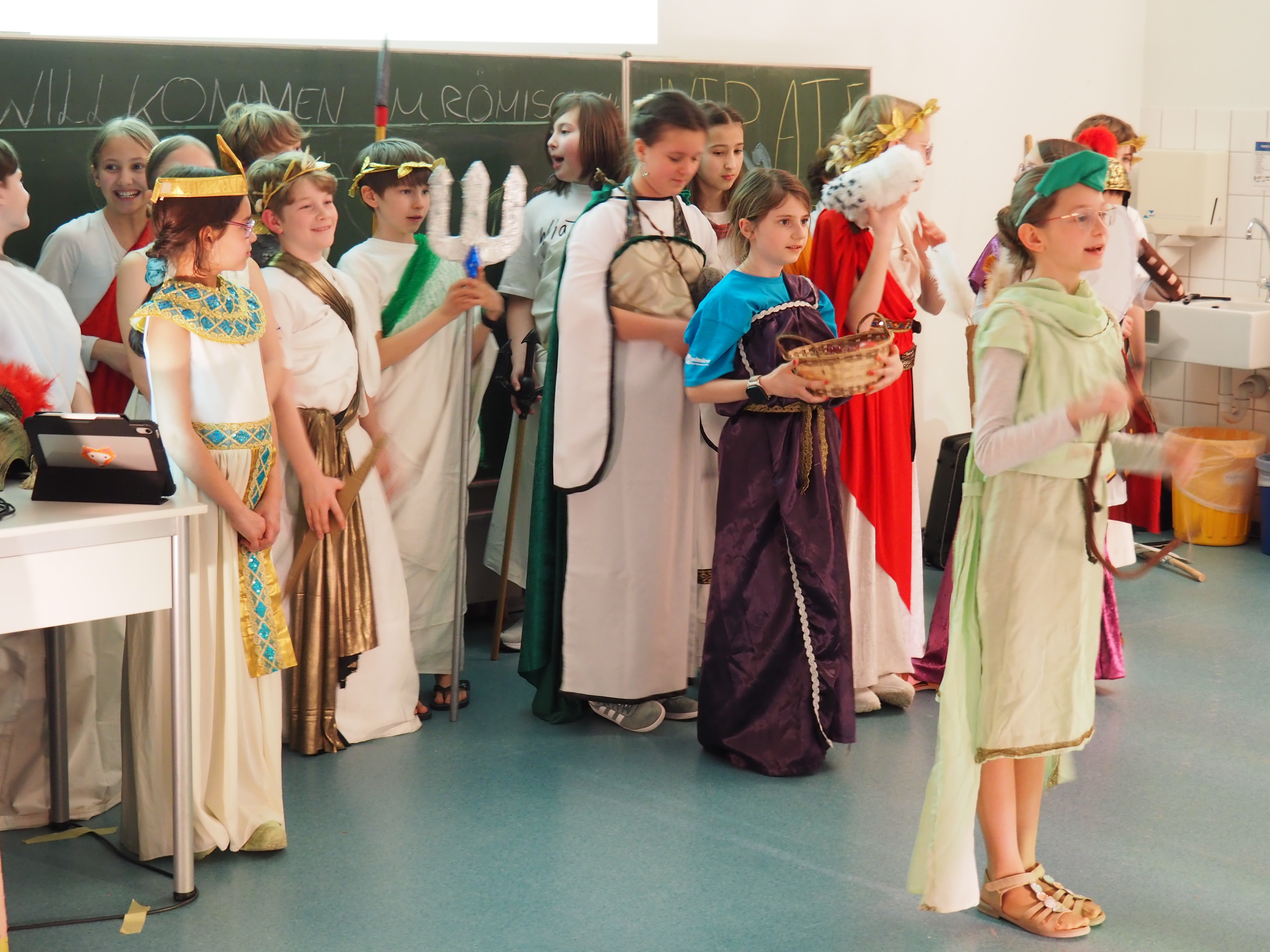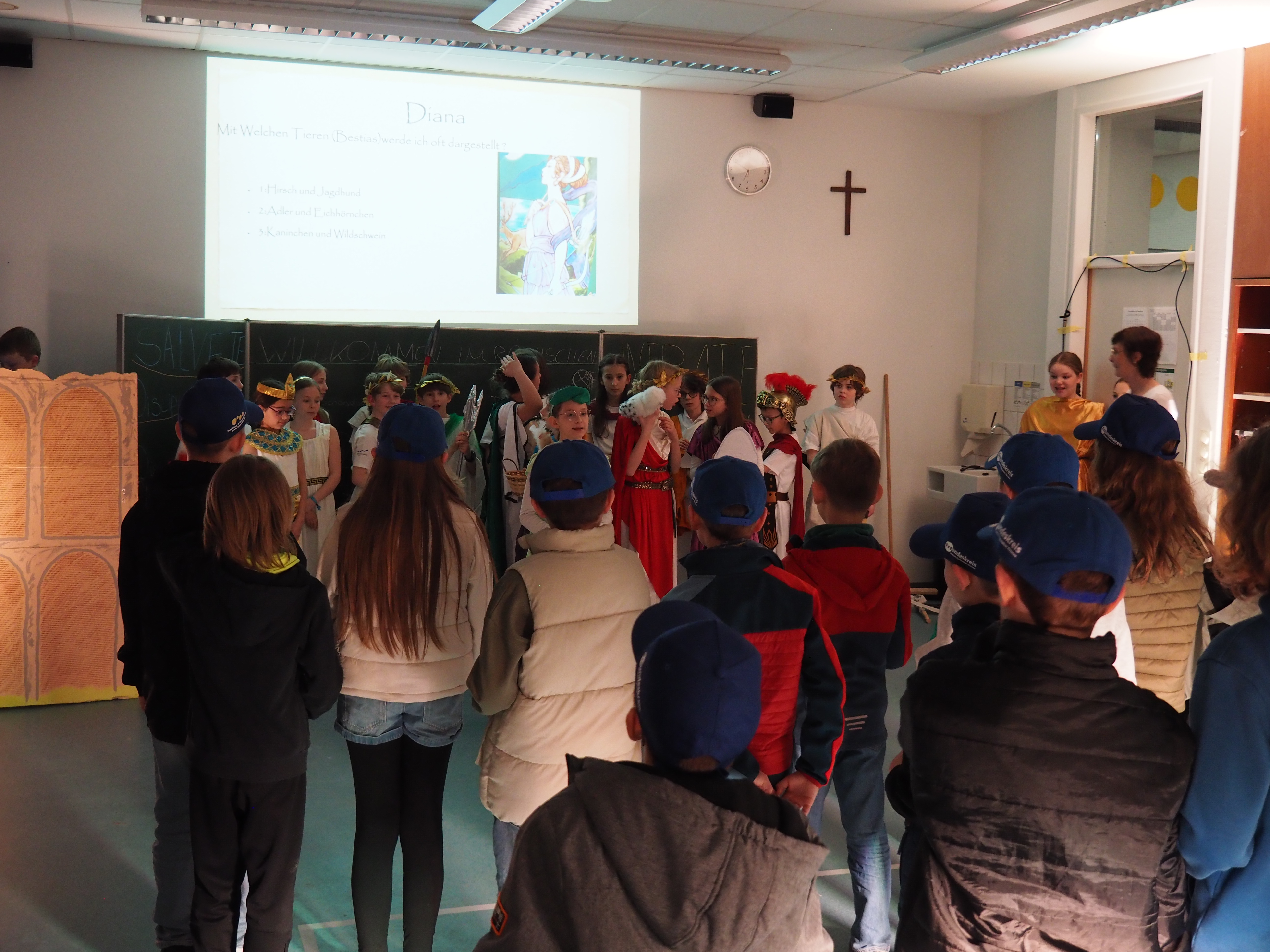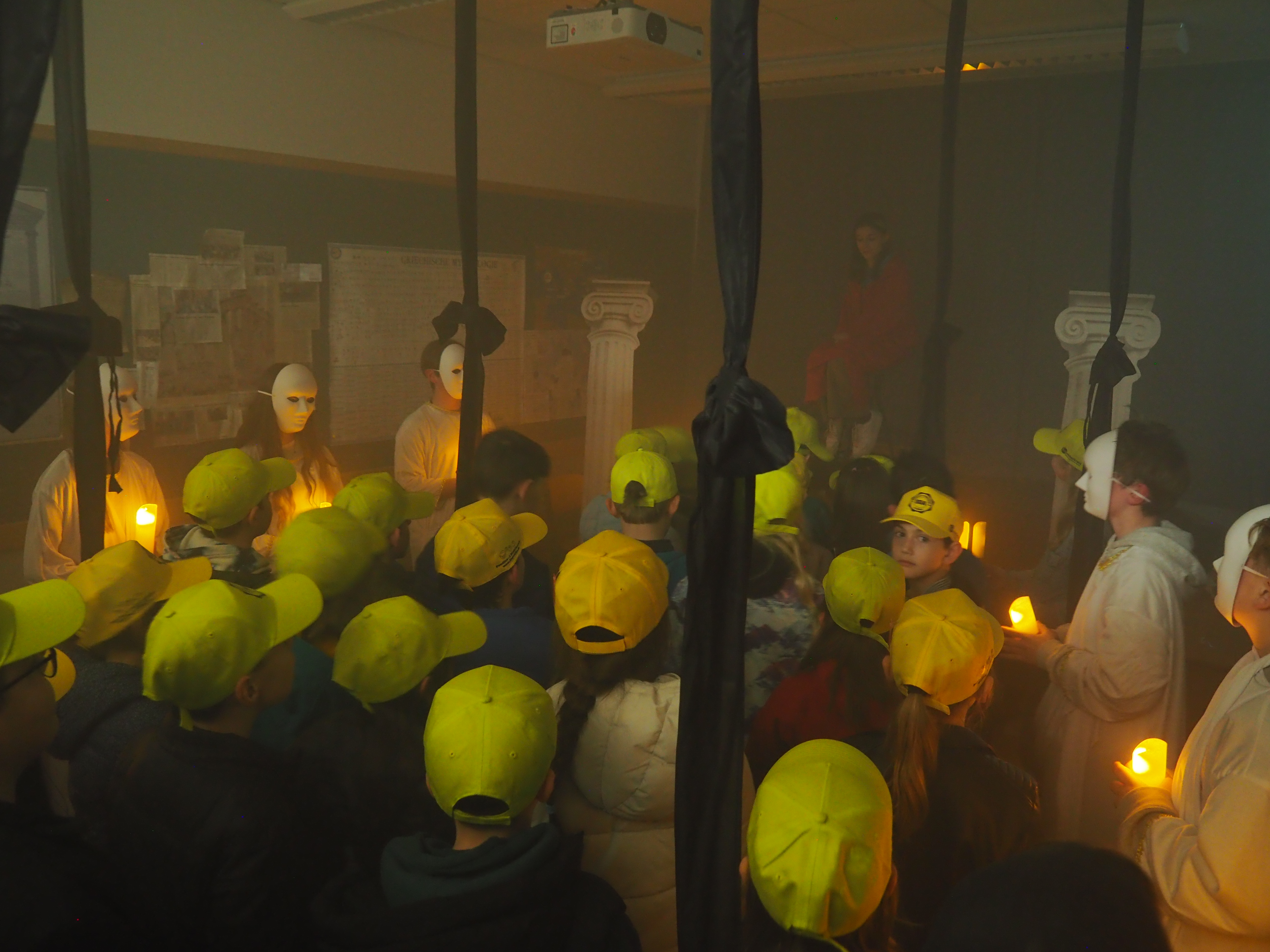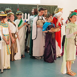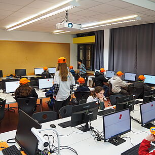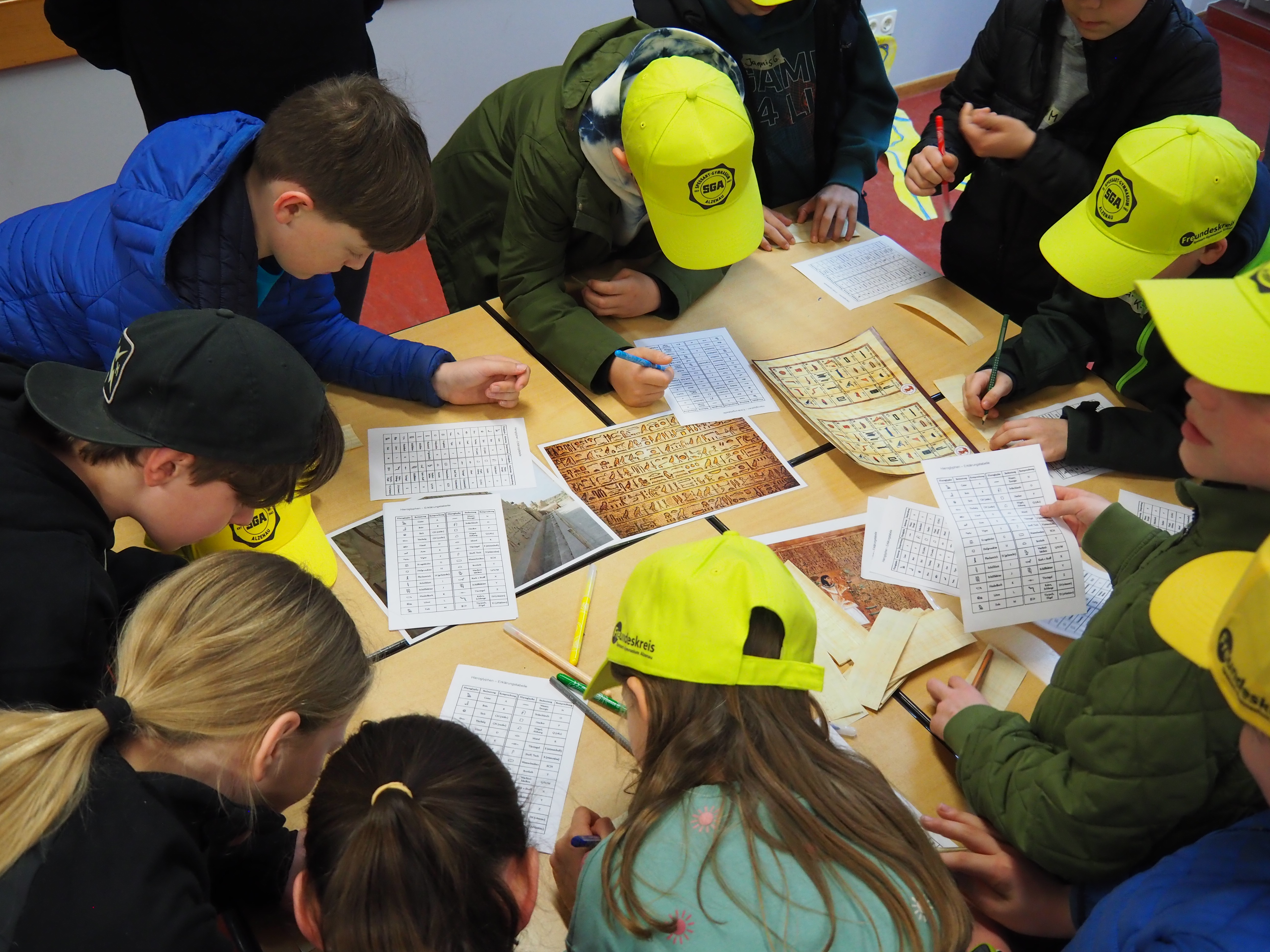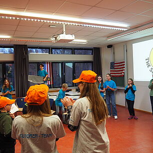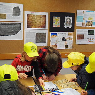 Dann kam der große Moment für die Viertklässlerinnen und Viertklässler: Ausgestattet mit bunten SGA‑Mützen, die ebenso vielfältig waren wie das schulische Angebot, saßen sie gespannt auf den Bänken der Sporthalle. Das Tutorenteam stellte sich auf der Bühne vor und nahm die Kinder – nach Farben eingeteilt – mit auf eine spannende Entdeckungsreise durch das Schulhaus. An den zahlreichen Stationen wartete ein abwechslungsreiches Programm: explodierende Gummibärchen in den Naturwissenschaften, knifflige Spielaufgaben in Mathematik, das Programmieren von Robotern in Natur und Technik, eine leseerfüllte Auszeit in der Bibliothek bei spannenden Geschichten. In Latein begaben sich die Kinder zu den Göttern des Olymps, in Griechisch erhielten sie beim Orakel von Delphi einen Blick in die Zukunft und in Englisch durften sie ihren eigenen Song kreieren. In Geschichte wurden Hieroglyphen der alten Ägypter entziffert, in Physik sorgten die Glühgurken für großes Staunen – und es gab noch vieles mehr zu entdecken.