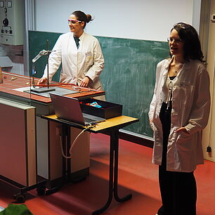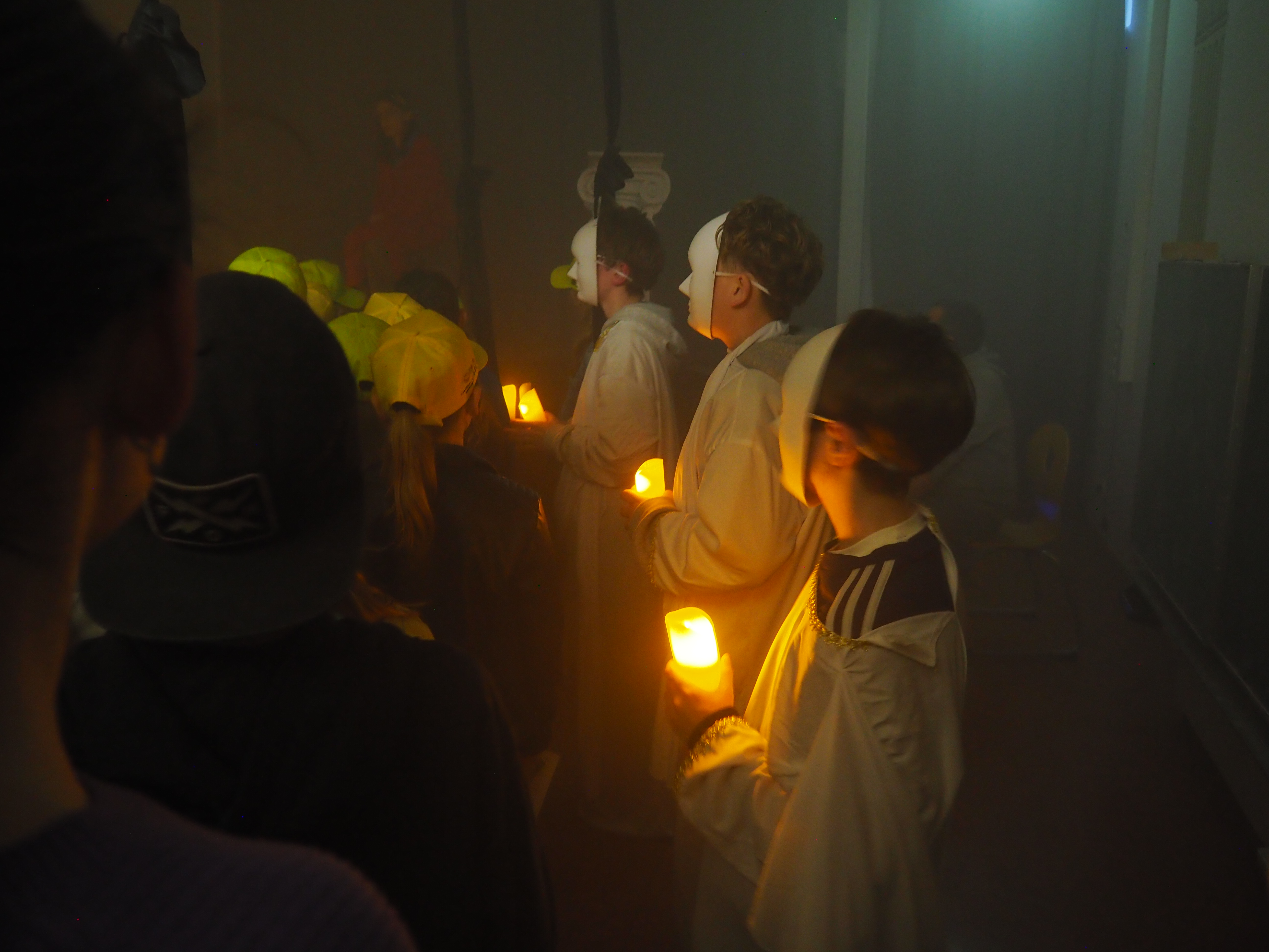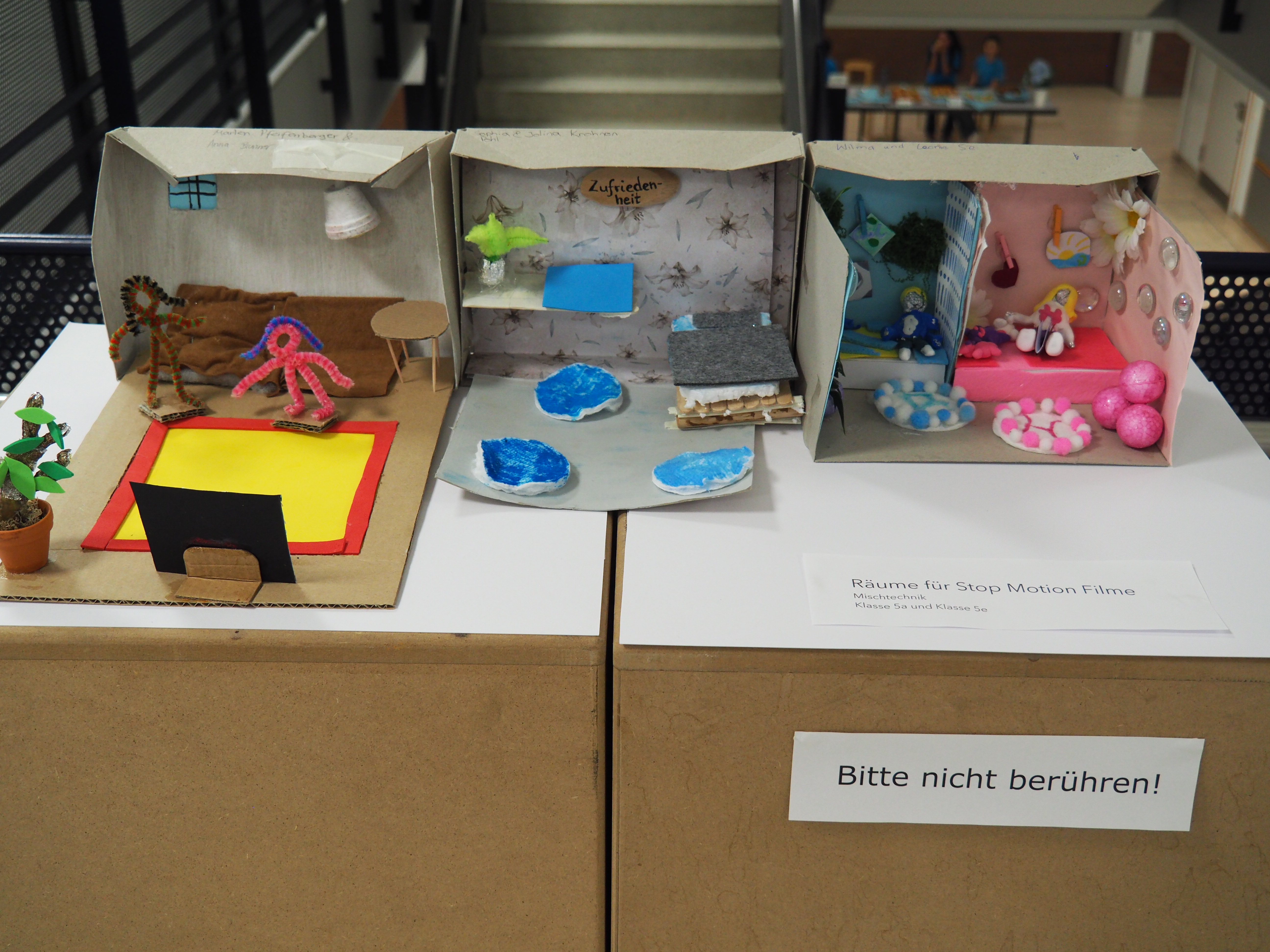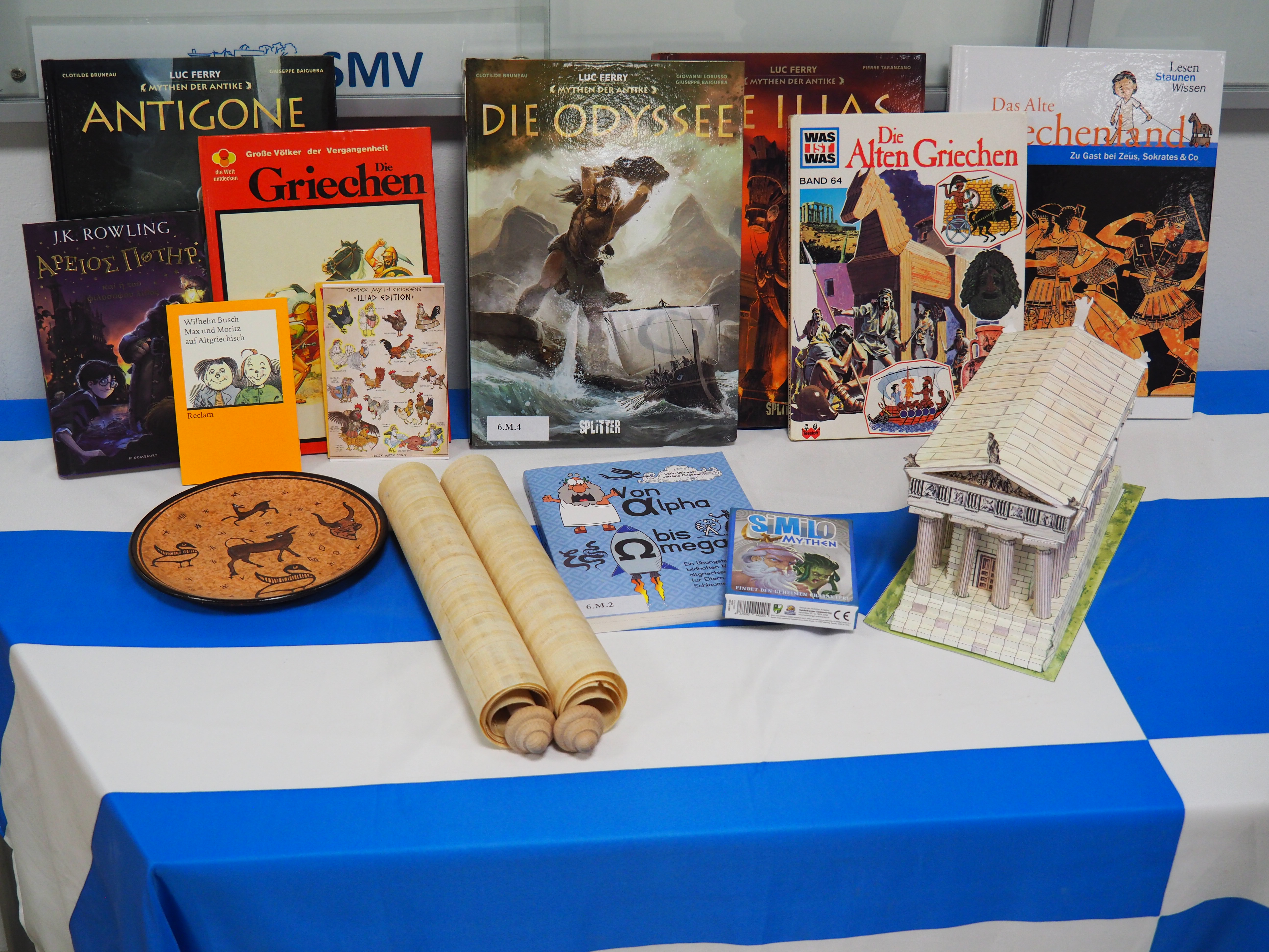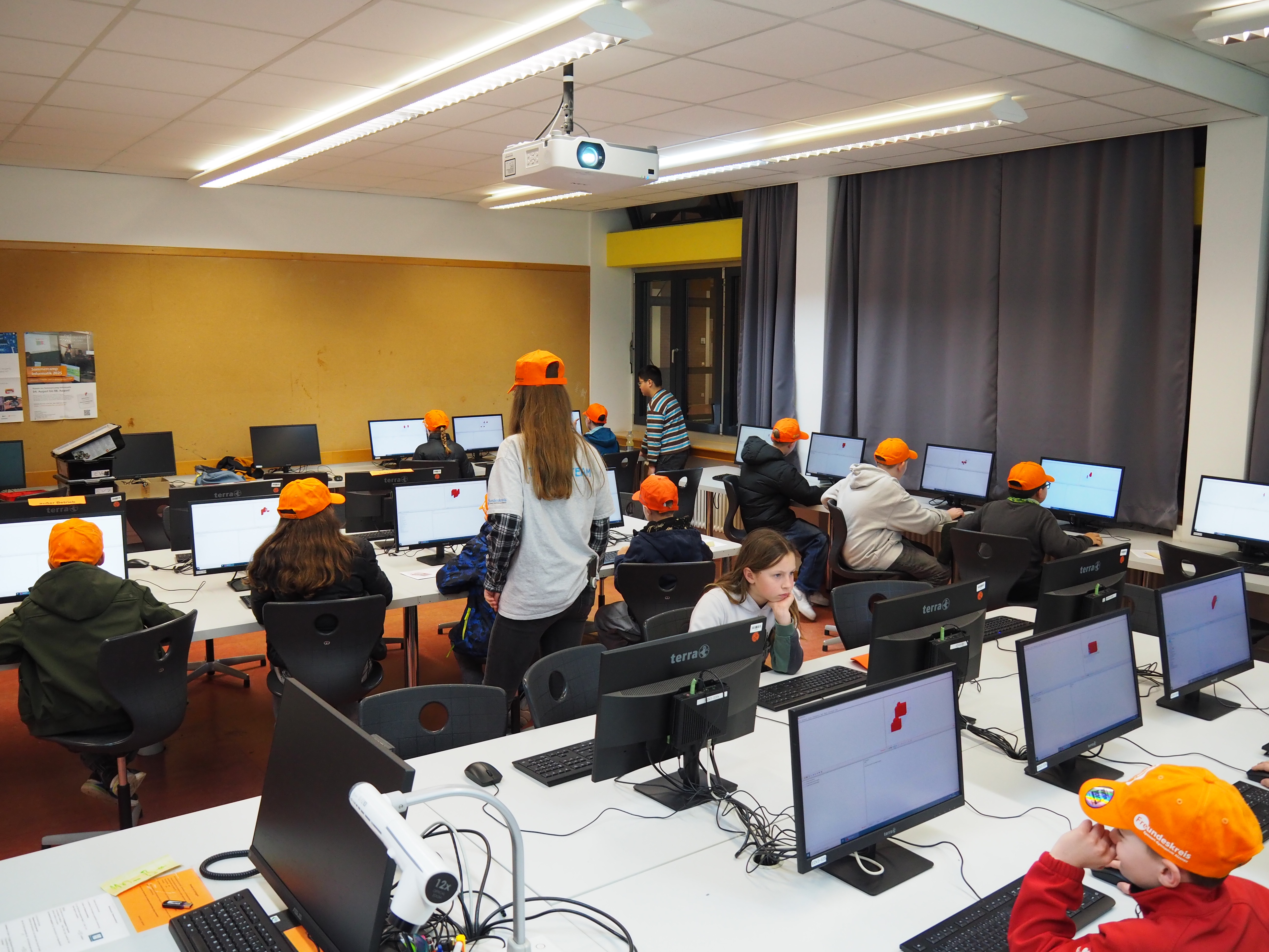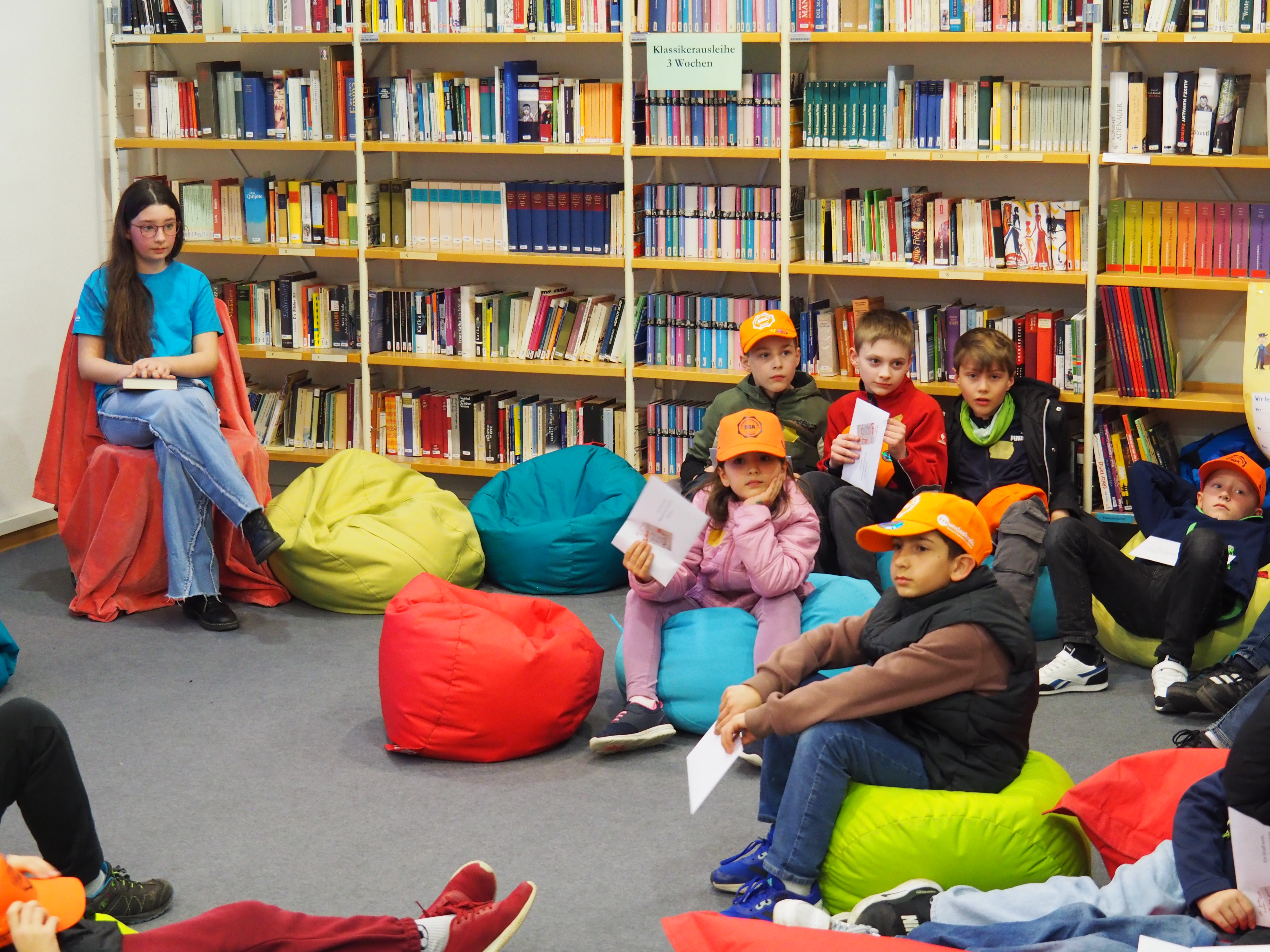 Dann kam der große Moment für die Viertklässlerinnen und Viertklässler: Ausgestattet mit bunten SGA‑Mützen, die ebenso vielfältig waren wie das schulische Angebot, saßen sie gespannt auf den Bänken der Sporthalle. Das Tutorenteam stellte sich auf der Bühne vor und nahm die Kinder – nach Farben eingeteilt – mit auf eine spannende Entdeckungsreise durch das Schulhaus. An den zahlreichen Stationen wartete ein abwechslungsreiches Programm: explodierende Gummibärchen in den Naturwissenschaften, knifflige Spielaufgaben in Mathematik, das Programmieren von Robotern in Natur und Technik, eine leseerfüllte Auszeit in der Bibliothek bei spannenden Geschichten. In Latein begaben sich die Kinder zu den Göttern des Olymps, in Griechisch erhielten sie beim Orakel von Delphi einen Blick in die Zukunft und in Englisch durften sie ihren eigenen Song kreieren. In Geschichte wurden Hieroglyphen der alten Ägypter entziffert, in Physik sorgten die Glühgurken für großes Staunen – und es gab noch vieles mehr zu entdecken.