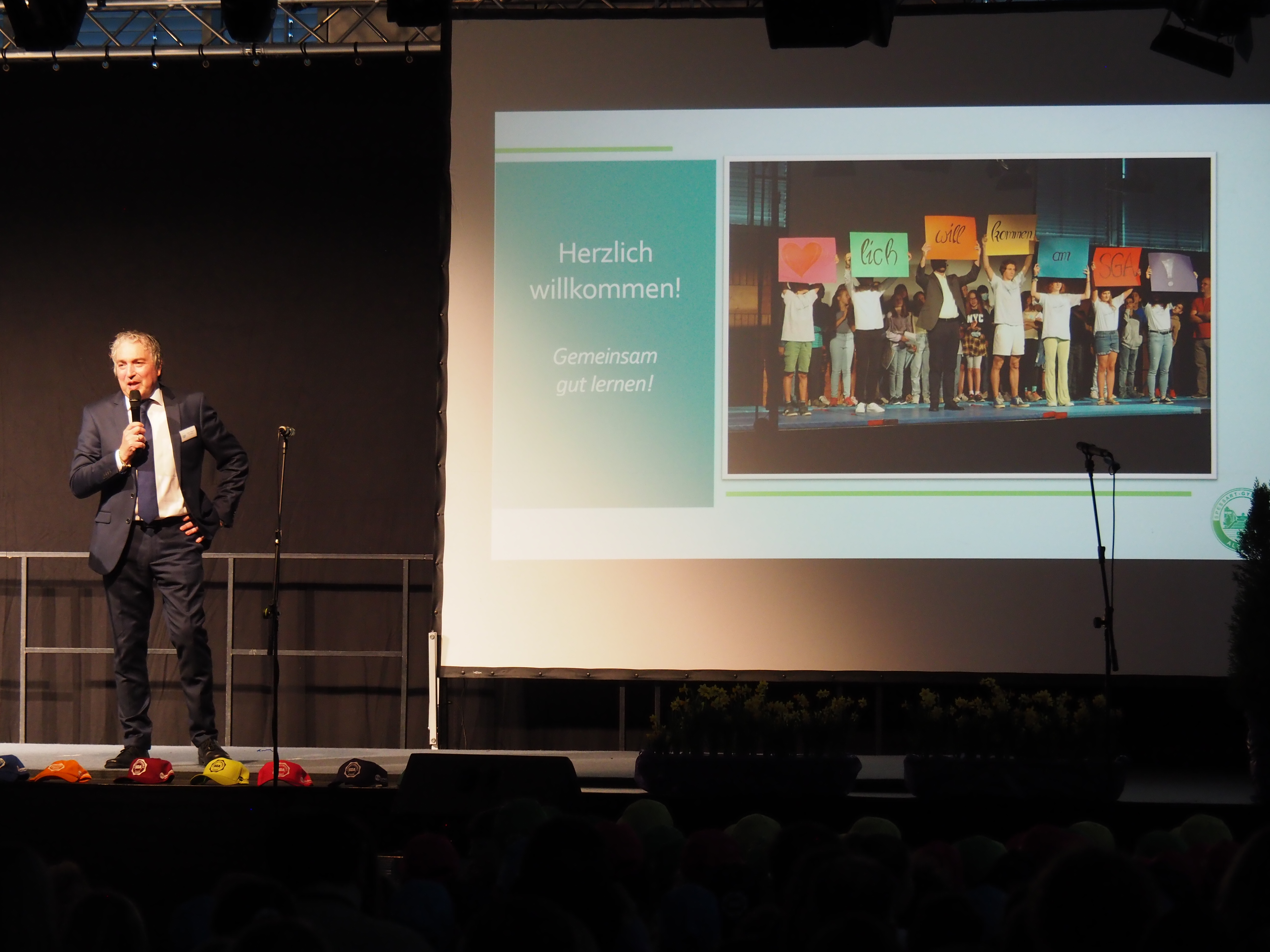 Währenddessen erhielten die Eltern in einem Vortrag des Schulleitungsteams, der Unterstufenbetreuerin und der Beratungslehrerin einen umfassenden Einblick in das Schulkonzept. Dabei wurde deutlich: Das SGA ist eine innovative Schule mit zahlreichen Auszeichnungen und Wettbewerbserfolgen – und zugleich ein Ort, an dem der Mensch im Mittelpunkt steht. Denn Leistung kann nur dort entstehen, wo man sich wohlfühlt und ein wertschätzendes Miteinander gelebt wird. Diese Sichtweise bestätigten auch die Schulsprecher der SMV sowie der Elternbeirat, die das SGA als starke Gemeinschaft erleben. Besonders berührend war der Bericht einer Mutter einer aktuellen 5.-Klässlerin. Sie schilderte ihre ersten Eindrücke nach dem Schulwechsel ihrer Tochter und betonte, wie sehr sie spüre, dass die Schule hinter den Kindern steht und alle – insbesondere die Lehrkräfte – ihr Bestes geben, um jedes Kind individuell zu begleiten.