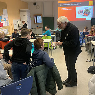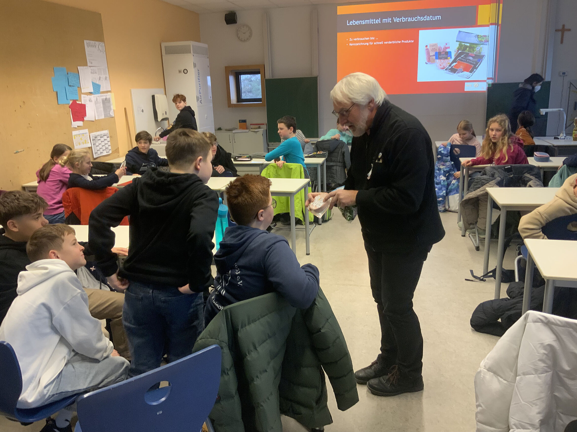 Die Schülerinnen und Schüler der beiden sechsten Klassen waren sehr interessiert und aufmerksam. Sie beantworteten Herrn Geibs Fragen souverän und äußerten selbst viele Gedanken, die sie beschäftigten. Mit Lebensmitteln zum Anfassen wurde auch erklärt, worin der Unterschied zwischen dem Mindesthaltbarkeitsdatum und der Angabe „zu verbrauchen bis…“ besteht.