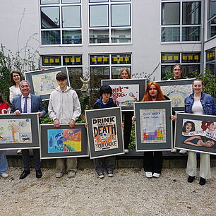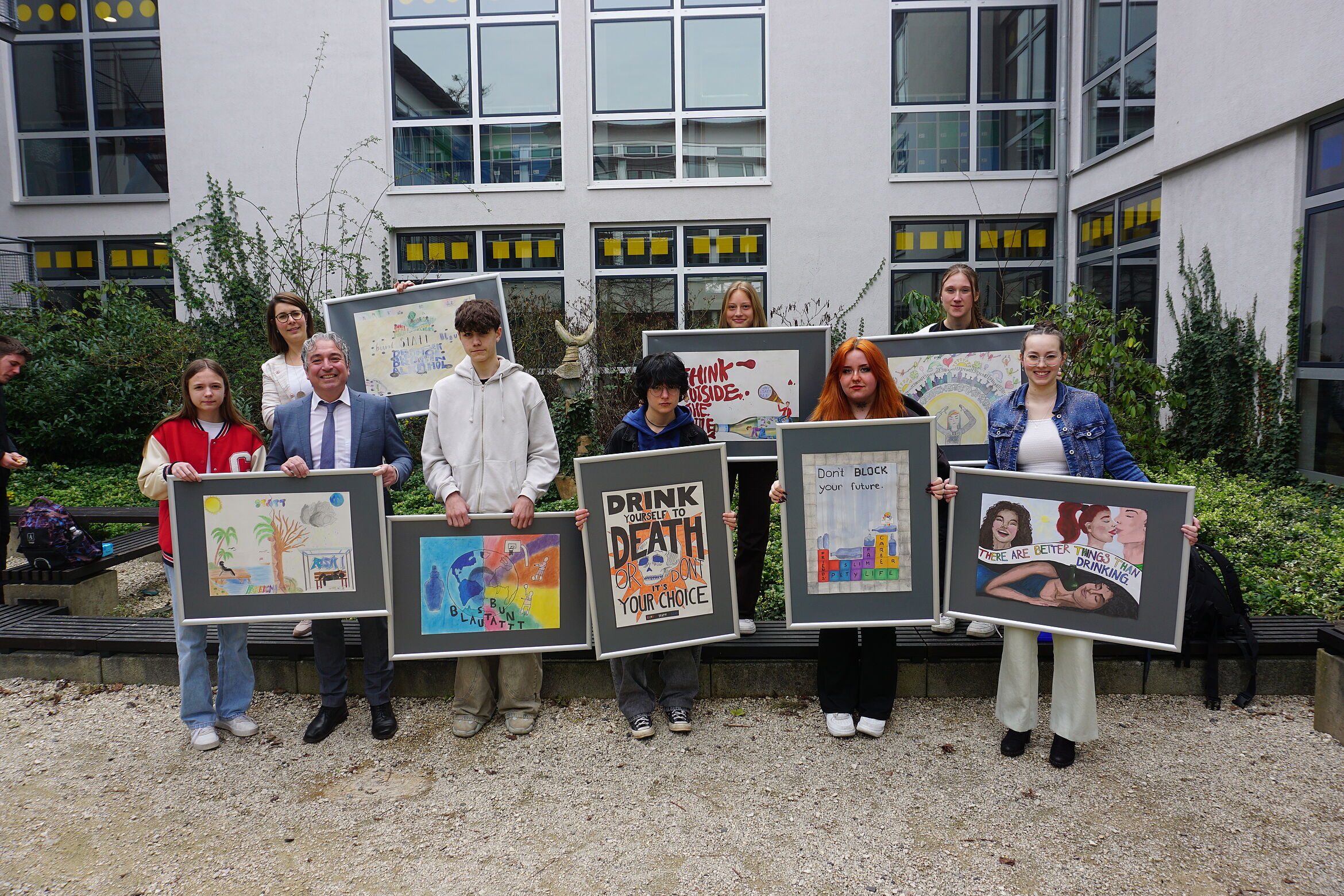 Die Schülerinnen und Schüler der Klassen 10+a und 7d hatten im vergangenen Jahr 2023 im Rahmen des Kunstunterrichts an dem Wettbewerb „bunt statt blau 2023: Kunst gegen Komasaufen“ teilgenommen. Der von Seiten der Deutschen Angestellten-Krankenkasse (DAK) aus initiierte Plakatwettbewerb möchte gezielt Kinder und Jugendliche auf die Risiken durch Alkoholkonsum aufmerksam machen und wirbt im Allgemeinen für ein buntes und gesundes Leben.