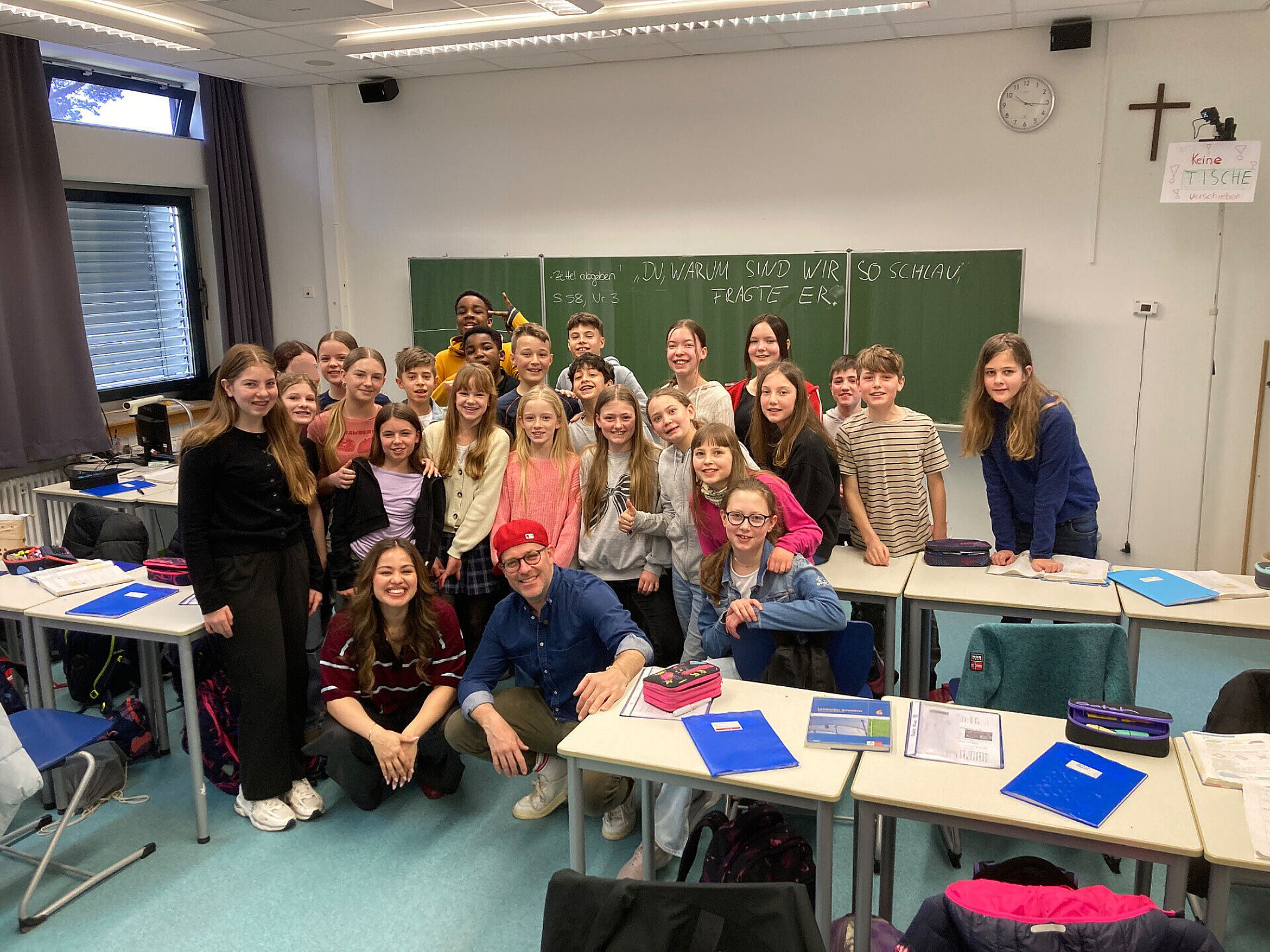 Am Ende der zehnminütigen Wettkampfzeit hatte die Klasse somit nicht nur den Joker, sondern auch ganze 490€ für die Klassenkasse erspielt. Die Stimmung war demnach überaus ausgelassen, zumal sich nun auch die gewaltige Anspannung, unter der die Kinder standen, endlich löste. Nach der Aufzeichnung der Sendung blieb noch genügend Zeit für ein persönliches Gespräch mit den Moderatoren, die ihre besten Spickmethoden verrieten. Sarah und Ben zeigten sich überaus zugänglich und versorgten nicht nur die Schülerinnen und Schüler der Klasse 6c, sondern auch zahlreiche andere Fans, die sich auf den Gängen vor dem Klassenzimmer drängten, mit Selfies und Autogrammen.