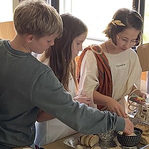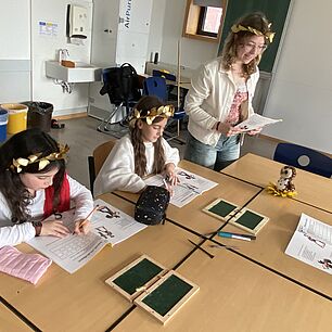 Dabei hatten die Teilnehmerinnen und Teilnehmer des P-Seminars keine Mühen gescheut: Wachstäfelchen wurden im Vorfeld selbst hergestellt, Modelle gebastelt und Rezepte ausprobiert. Die Mischung aus Mitmachen, Ausprobieren und Erklären kam bei den Viertklässlern hervorragend an. Viele zeigten sich überrascht, wie spannend die Antike und die römische Sprache - es gab auch einen Schnupperkurs dazu - sein können. „Das hat richtig Spaß gemacht!“ – so lautete am Schluss der Tenor.