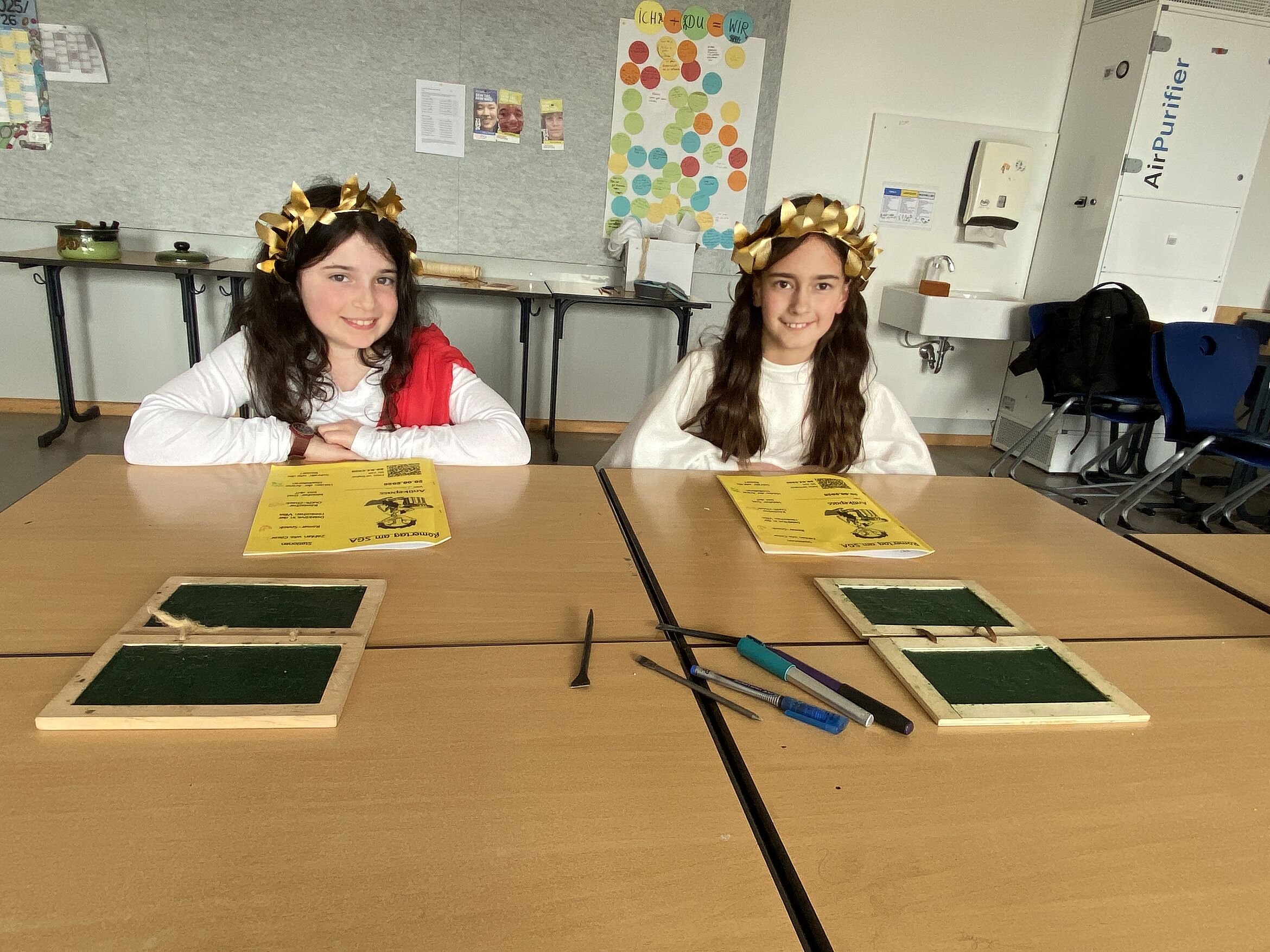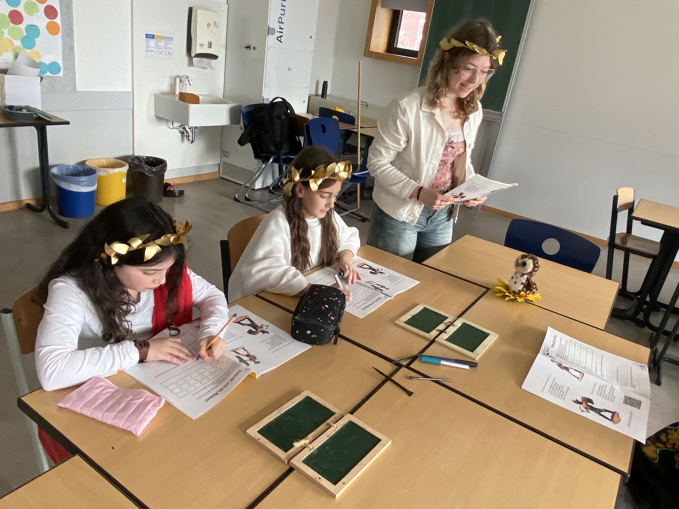 Besonders anschaulich wurde es bei Themen wie „Detektive in der römischen Villa“, wo die Kinder erfuhren, wie wohlhabende Römer lebten, oder bei „Welcher Gott bist du?“, bei dem sie die Götterwelt rund um Jupiter und Co. erkundeten. Auch knifflige Aufgaben durften nicht fehlen: Beim Stationenspiel „Zählen wie Cäsar“ knobelten die Schülerinnen und Schüler mit römischen Zahlzeichen, während sie bei „Wachstäfelchen: das antike iPad“ selbst ausprobieren konnten, wie in der Antike auf Wachs oder Papyrus geschrieben wurde.