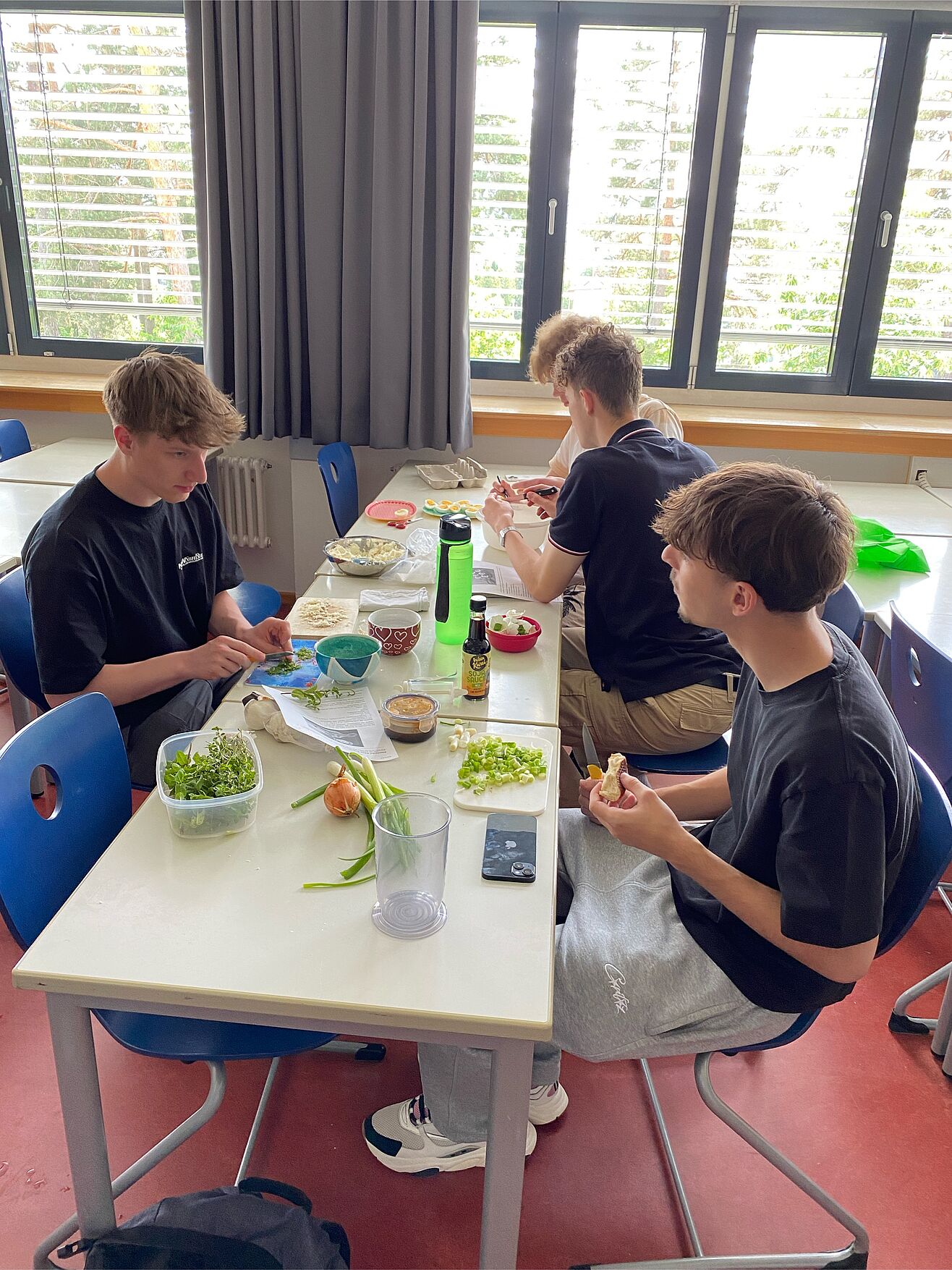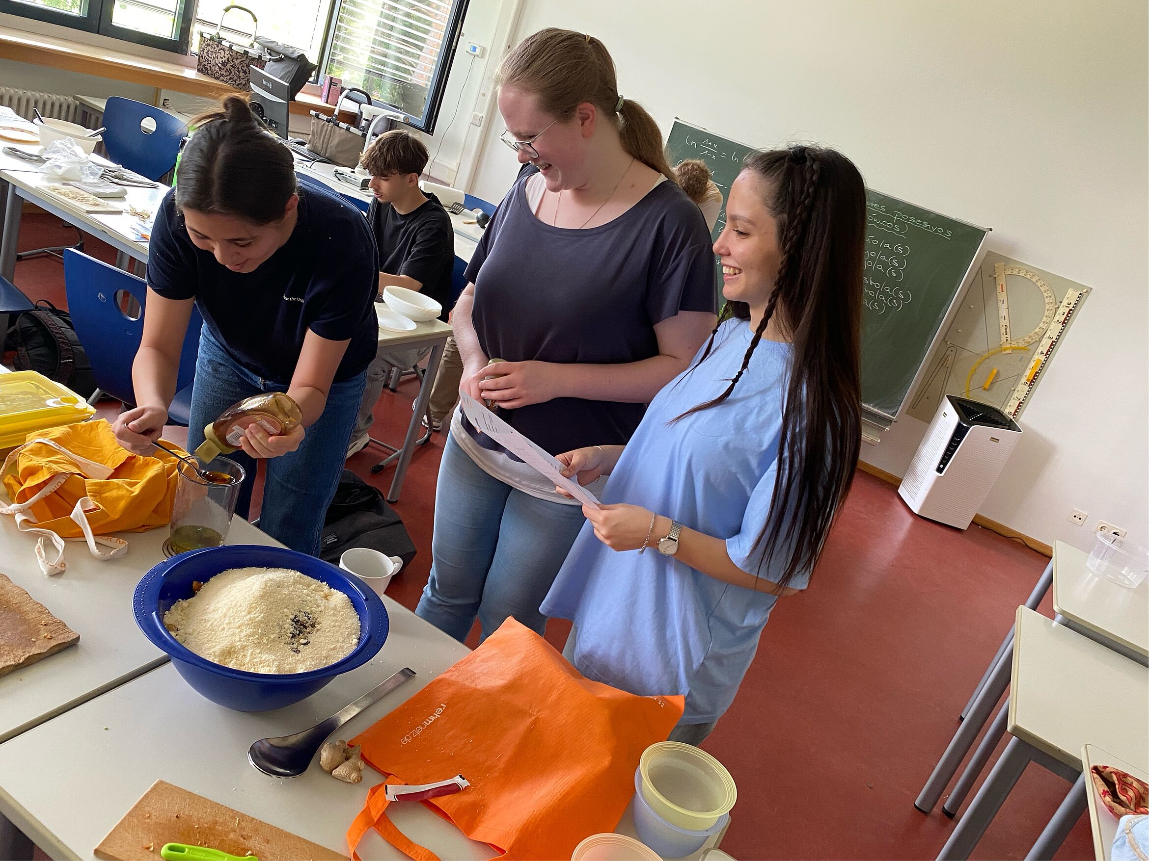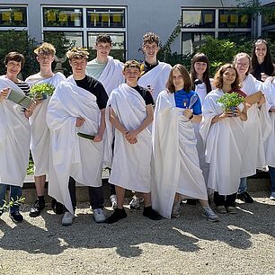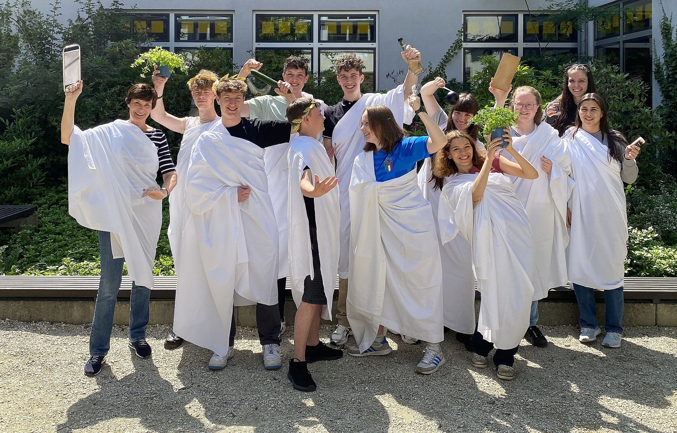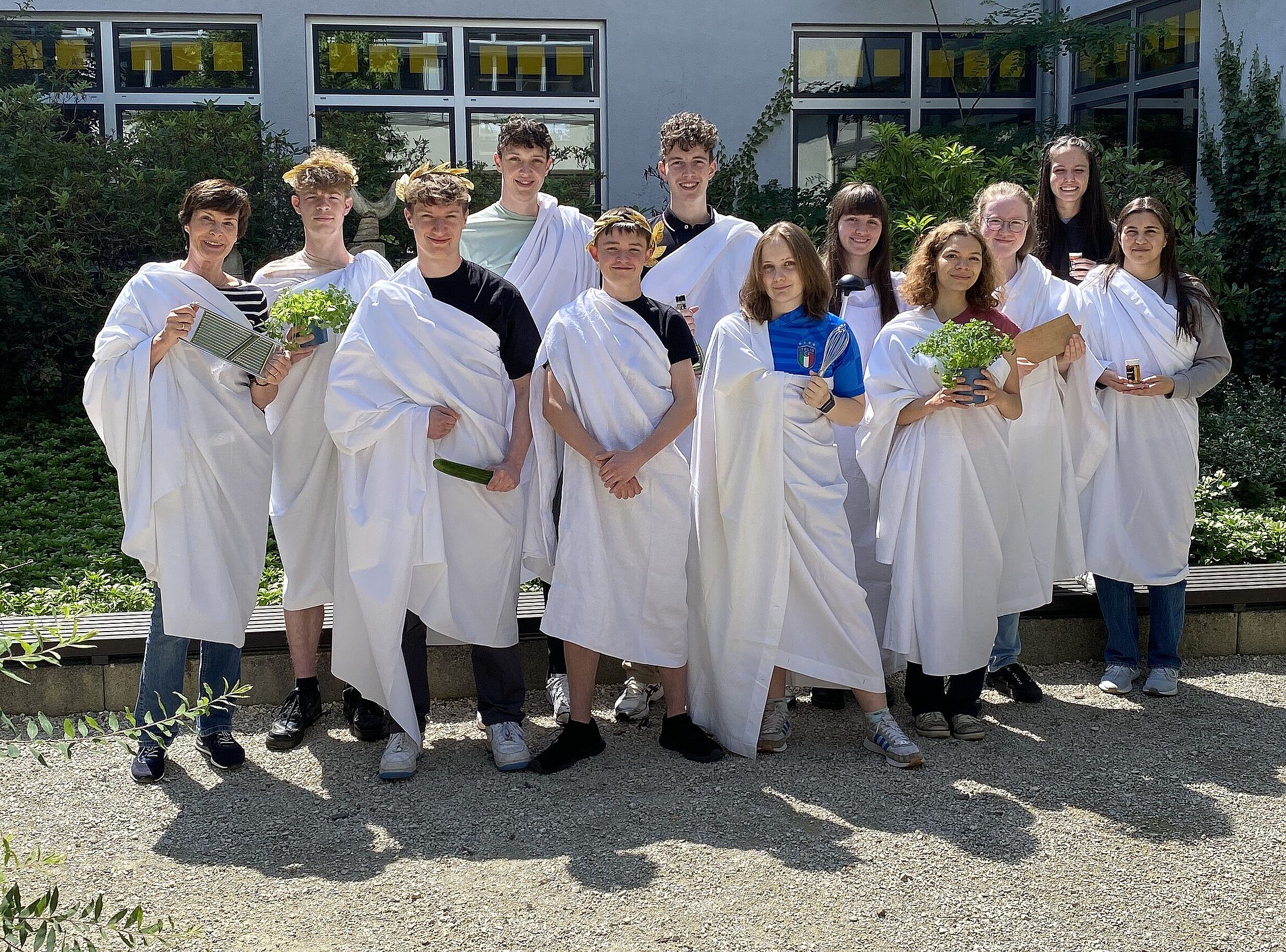 Gefüllte Haselmäuse mit Mohn oder doch lieber gegrillte Flamingozungen? Nach der Lektüre von Petrons Cena Trimalchionis versuchte sich der Oberstufenkurs Latein am 7.6.2024 an einigen antiken Rezepten und entschied sich für ein dreigängiges Menü, das nachgekocht werden sollte. Die meisten Rezepte der Römer, die heute noch existieren, wurden damals von Marcus Apicius aufgeschrieben. Er lebte im 1. Jahrhundert nach Christus und sein Kochbuch ,,De re coquinaria“ (Über die Kochkunst) mit über 400 Rezepten enthält ziemlich ausgefallene Gerichte wie zum Beispiel Schweineeuter oder Schnecken, aber auch eher einfache Speisen, die selbst heute noch nachgekocht werden können. Der Kurs entschied sich daher für gefüllte Eier, Linsensalat mit Kastanien, Moretum (Kräuter-Käse-Creme mit viel Knoblauch), Hähnchensalat mit Frühlingszwiebeln, karamellisierte Datteln und Birnenauflauf (Patina de piris). Weiterhin durften auch ein deftiges Rosmarinbrot und Traubensaft nicht fehlen. Gewürzt wurde mit Kräutern (Schnittlauch, Petersilie, Thymian, Minze, Estragon und Liebstöckel), Honig und Essig. Das von Apicius häufig verwendete Garum, eine aus Fischen und deren Eingeweide hergestellte Gewürzsauce, wurde durch eine Sojasauce ersetzt. Fazit: Die Römer liebten die kreative Küche, d.h. genaue Mengenangaben waren ihnen fremd. Aber mit etwas Fantasie kann man leckere Gerichte zaubern!