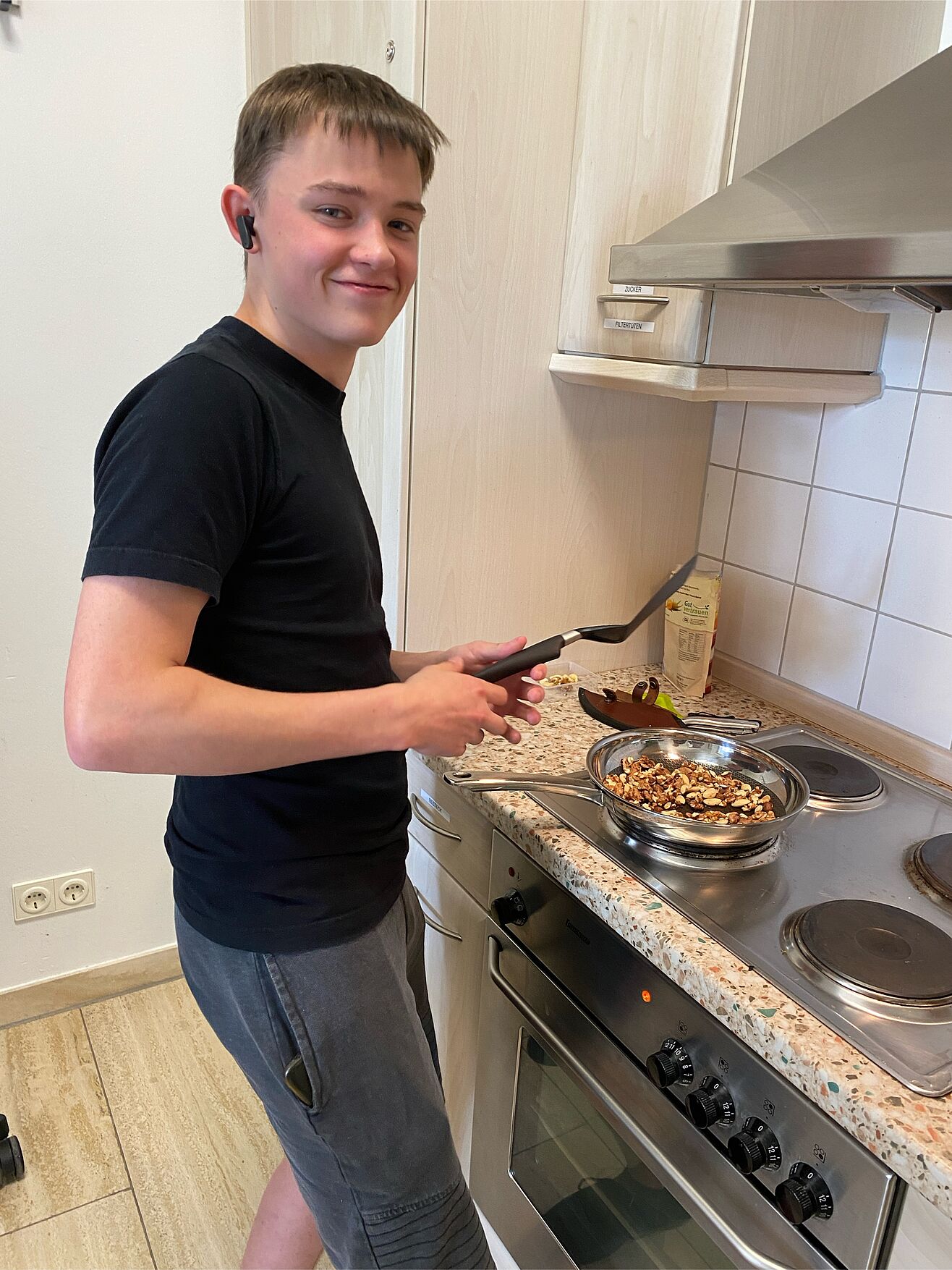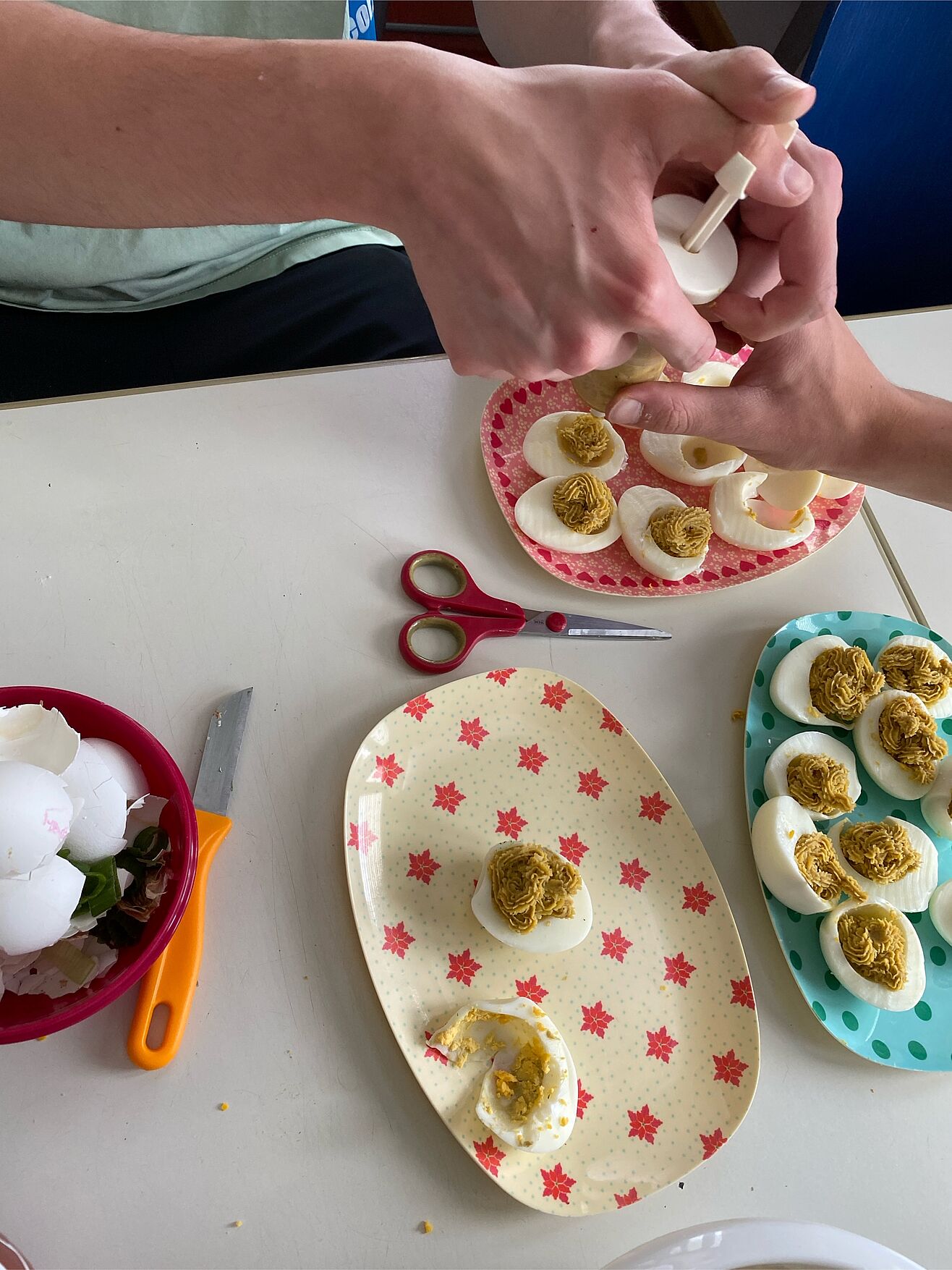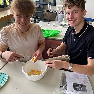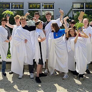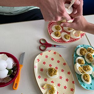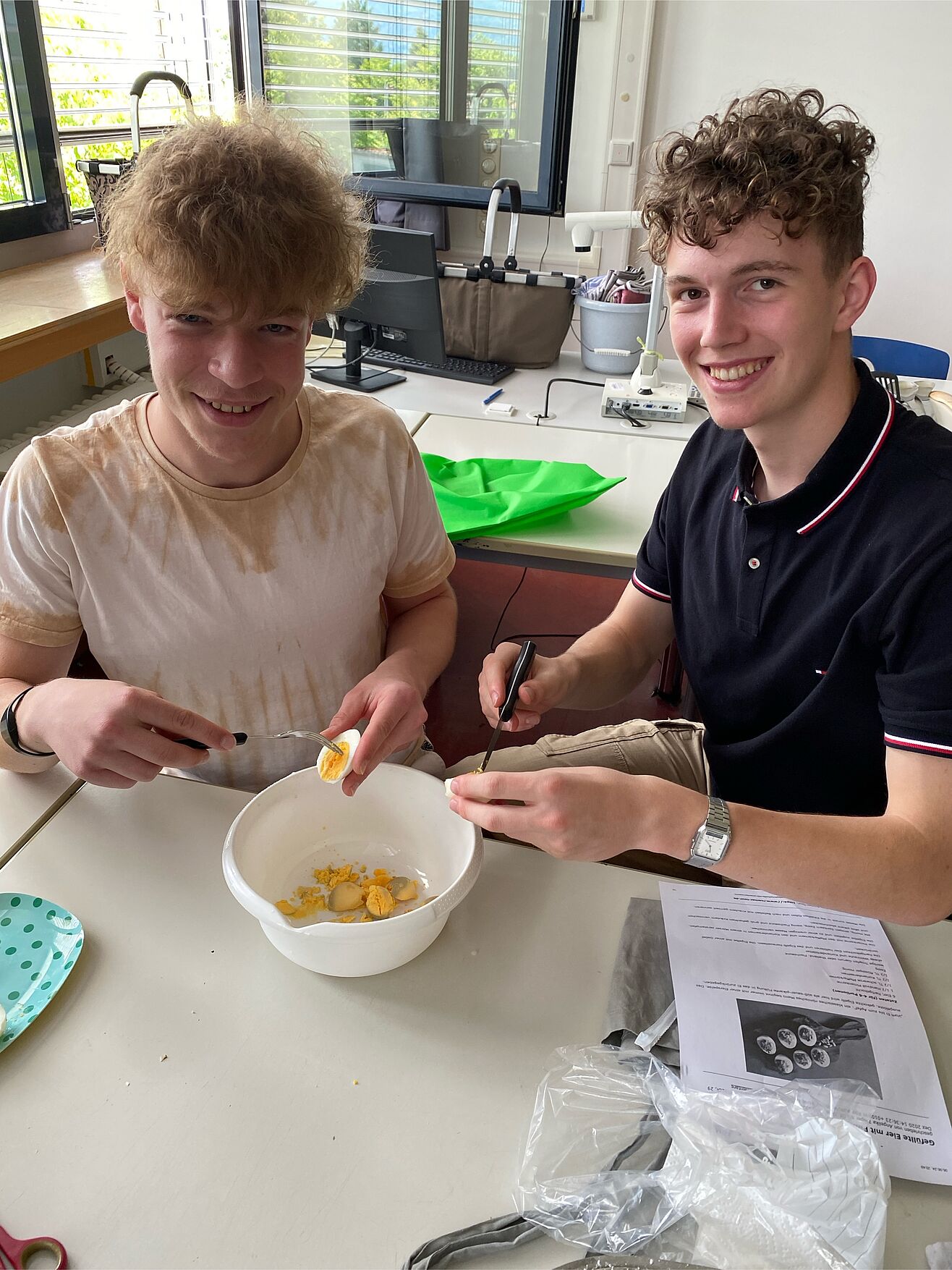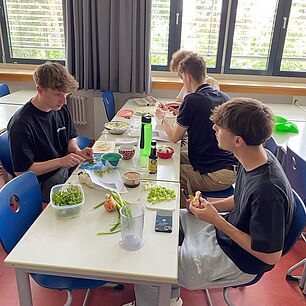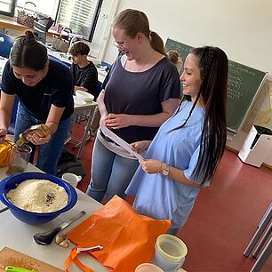 Gefüllte Haselmäuse mit Mohn oder doch lieber gegrillte Flamingozungen? Nach der Lektüre von Petrons Cena Trimalchionis versuchte sich der Oberstufenkurs Latein am 7.6.2024 an einigen antiken Rezepten und entschied sich für ein dreigängiges Menü, das nachgekocht werden sollte. Die meisten Rezepte der Römer, die heute noch existieren, wurden damals von Marcus Apicius aufgeschrieben. Er lebte im 1. Jahrhundert nach Christus und sein Kochbuch ,,De re coquinaria“ (Über die Kochkunst) mit über 400 Rezepten enthält ziemlich ausgefallene Gerichte wie zum Beispiel Schweineeuter oder Schnecken, aber auch eher einfache Speisen, die selbst heute noch nachgekocht werden können. Der Kurs entschied sich daher für gefüllte Eier, Linsensalat mit Kastanien, Moretum (Kräuter-Käse-Creme mit viel Knoblauch), Hähnchensalat mit Frühlingszwiebeln, karamellisierte Datteln und Birnenauflauf (Patina de piris). Weiterhin durften auch ein deftiges Rosmarinbrot und Traubensaft nicht fehlen. Gewürzt wurde mit Kräutern (Schnittlauch, Petersilie, Thymian, Minze, Estragon und Liebstöckel), Honig und Essig. Das von Apicius häufig verwendete Garum, eine aus Fischen und deren Eingeweide hergestellte Gewürzsauce, wurde durch eine Sojasauce ersetzt. Fazit: Die Römer liebten die kreative Küche, d.h. genaue Mengenangaben waren ihnen fremd. Aber mit etwas Fantasie kann man leckere Gerichte zaubern!