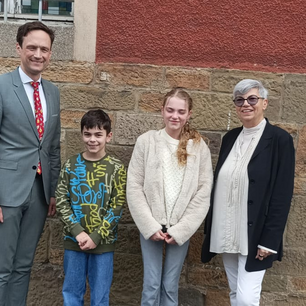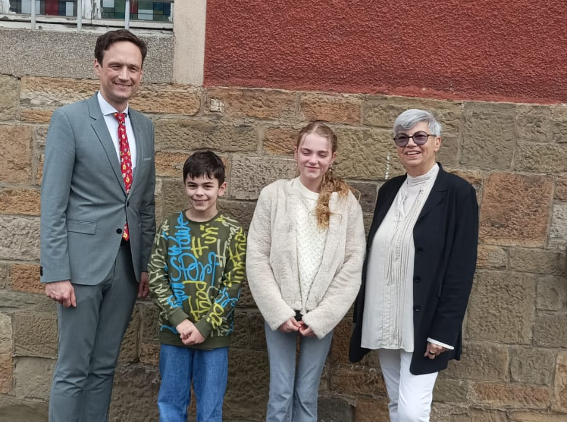Am 25. März war es soweit: Simon Fleckenstein fuhr mit seiner Mutter und zwei Klassenkameraden nach Schweinfurt, wo in der „Kulturwerkstatt Disharmonie“ ab 11. 00 Uhr der Bezirksentscheid des Vorlesewettbewerbs ausgetragen wurde. Die Moderatorin Ute Kempf begrüßte die zwölf Teilnehmenden, vier Jungs und acht Mädchen, die Jury und das anwesende Publikum. Die dreiminütigen Vorträge der vorbereiteten Textstellen hatten durchweg ein hohes Niveau, so dass es die Jury wieder nicht leicht hatte, bei der Punktevergabe zu differenzieren. Nach der Beratungspause, in der die Teilnehmenden sich stärken und kurz erholen konnten, folgte das Lesen einer unbekannten Textstelle. Die Veranstalter hatten das Buch „Flora Brimble und der verlorene Frühling“ von Marcus Raffel ausgewählt und zunächst las die Moderatorin vor, damit die Kinder sich in die Situation eindenken konnten. Simon war dann gleich als erster Kandidat an der Reihe und las den unbekannten Text so souverän, dass er später gemeinsam mit Rosalie aus Bad Kissingen zum Sieger des Bezirksentscheids gekürt wurde! Bei der Siegerehrung war dann auch der Landrat Florian Töpper zugegen und überreichte allen Teilnehmenden Urkunden und ein Buch. Anschließend wurde noch ein Foto gemacht, das die beiden Siegerkinder mit der Moderatorin Frau Kempf und dem Landrat Florian Töpper zeigt. Simon freut sich schon auf die nächste Runde, die dann am 18. Mai in Landshut stattfindet. Auch hierfür drückt die Schulfamilie Simon ganz fest die Daumen und wünscht viel Freude und Erfolg beim Vorlesen!