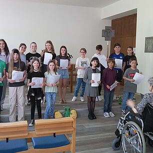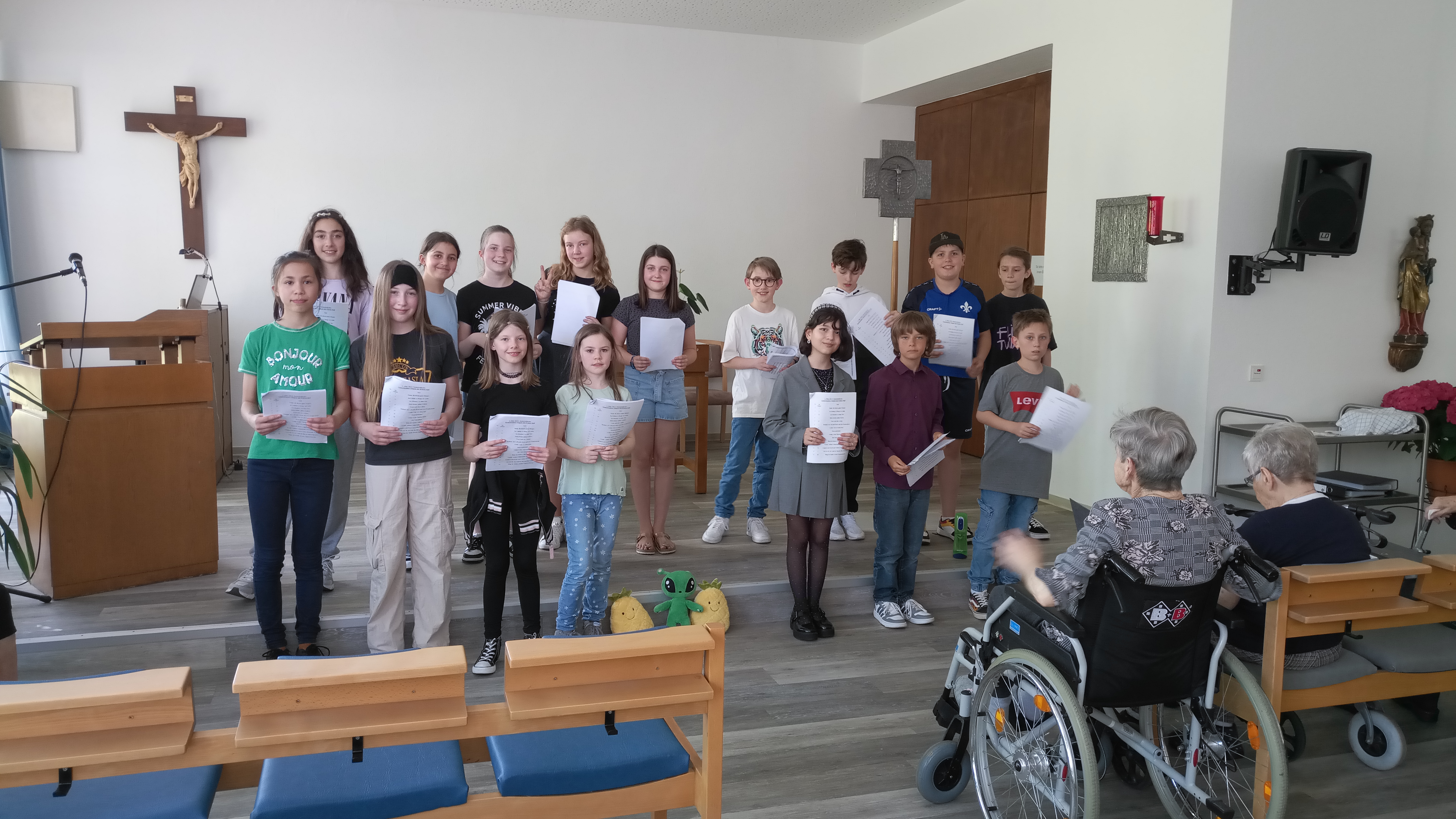 Dort konnten sie dann den in der hauseigenen Kapelle anwesenden Seniorinnen und Senioren – am Klavier begleitet durch ihren Musiklehrer – mit viel Begeisterung verschiedene flotte Lieder präsentieren wie z.B. „Mein kleiner grüner Kaktus“ und „Das Fahrradlied“. Aber vor allem wurden auch gemeinsam Stücke gesungen, die die Bewohnerinnen und Bewohner in der hauseigenen Liedermappe finden konnten. Auf dem Programm standen einige Wander- und Fahrtenlieder wie „Im Frühtau zu Berge wir ziehn“, „Bergvagabunden“, „Wohlauf, die Luft geht frisch und rein (Frankenlied)“ und auch besinnlichere Lieder wie „Am Brunnen vor dem Tore“ und „Freut euch des Lebens“. Außerdem kamen einige Hymnen zu Gehör wie „Gott mit dir, du Land der Bayern“ (Bayernhymne), „Einigkeit und Recht und Freiheit“ (Deutsche Hymne), „Freude, schöner Götterfunke“ (Europahymne). Und schließlich gab es auch geistliche Gesänge wie „Danke für diesen guten Morgen“, „Großer Gott wir loben dich“ und „Möge die Straße“ (Irische Segenswünsche).