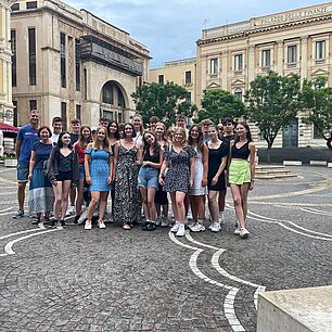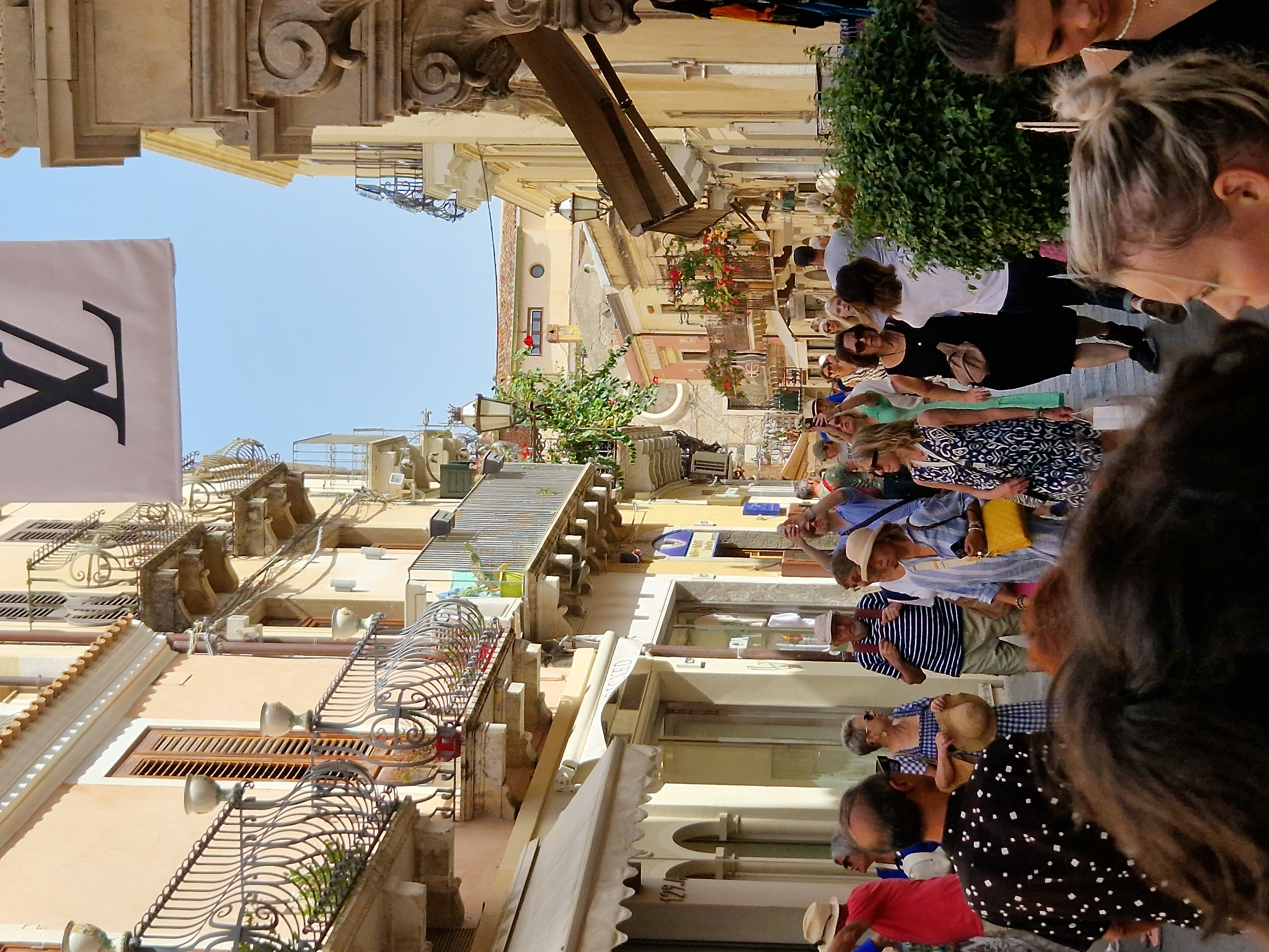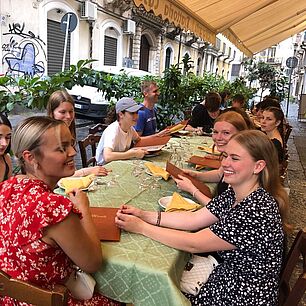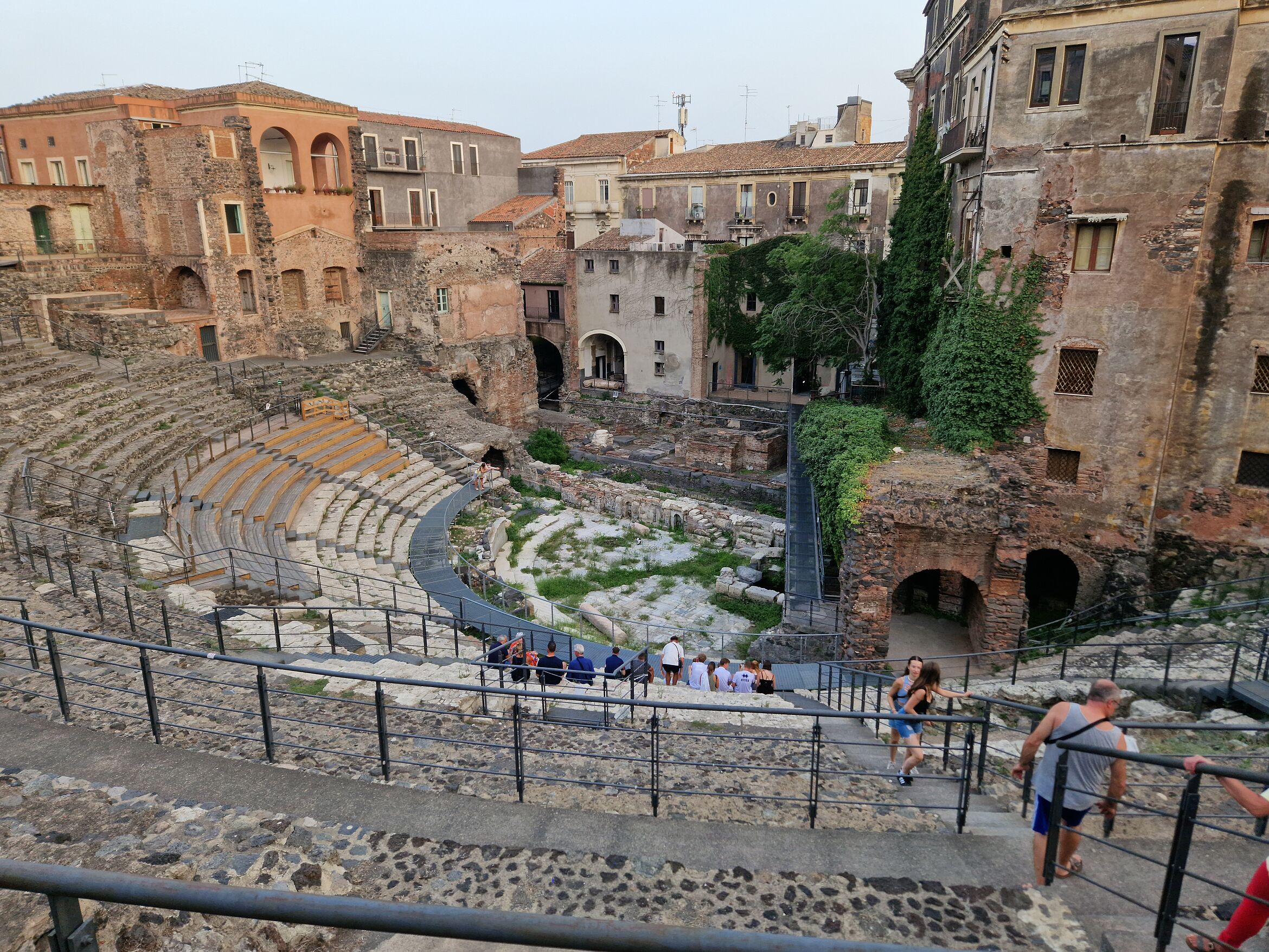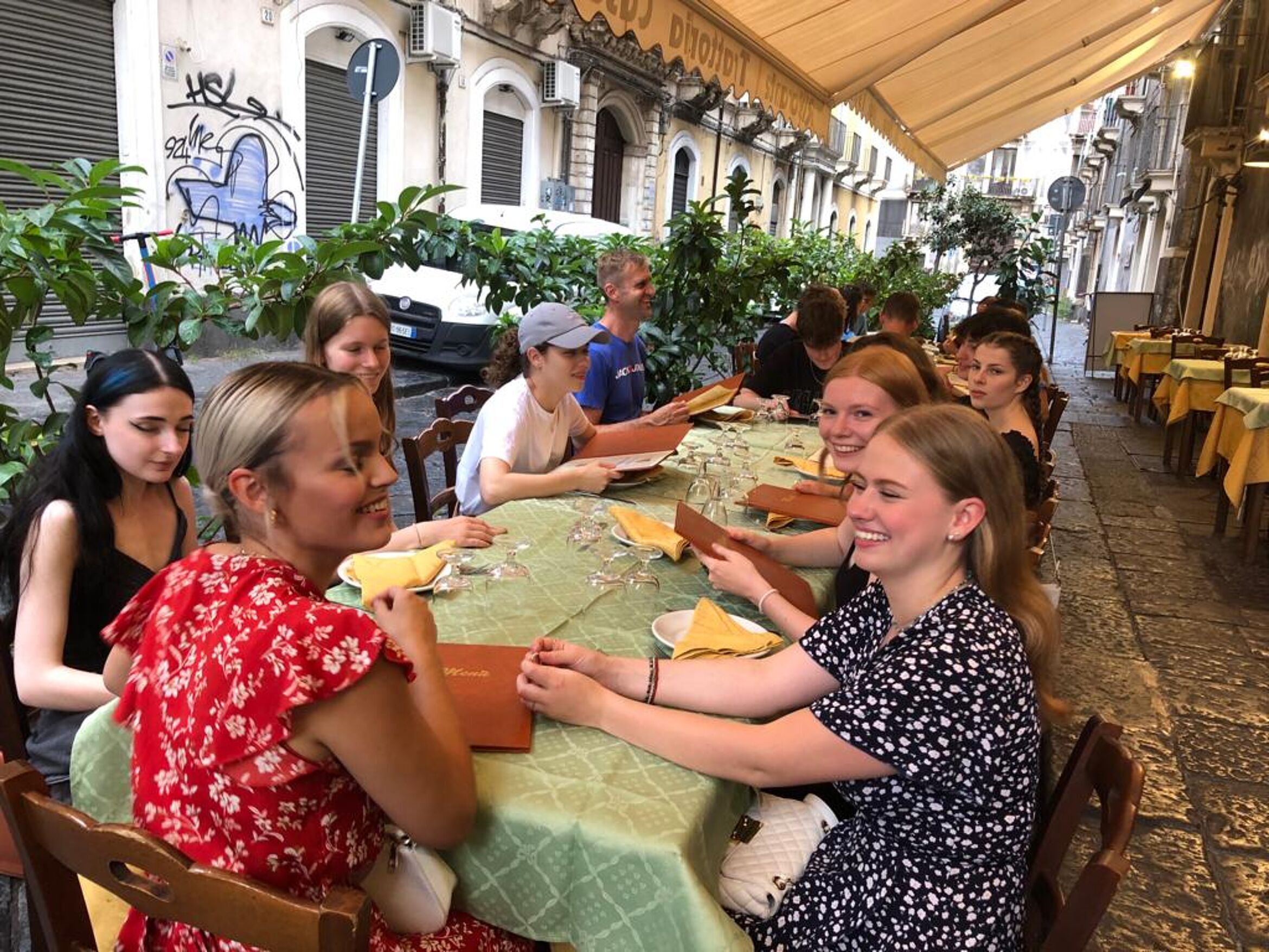 Samstag, 16.09.2023 um 5:00 Uhr: Topfit und gut gelaunt begibt sich die dezimierte Mannschaft zum Check-in am Frankfurter Flughafen. Nach einer letzten Stärkung meistern wir diese Aufgabe souverän und nehmen unsere Plätze im Flieger ein. Zwei Stunden später landen wir in Palermo und unsere Busreise nach Catania beginnt. Nach 3 1/2 Stunden Fahrt und einem kurzen Fußmarsch erreichen wir unsere Unterkunft für die nächste Woche. Von Außen wirkt die Unterkunft unscheinbar und optisch wenig ansprechend, von Innen jedoch erweist sie sich als ein wahrhaftiges Schmuckstück. Durch die Verteilung unserer Zimmer im dritten Stock der Unterkunft werden unsere Beine zum ersten Mal gefordert, wie auch in der restlichen Woche unserer Studienfahrt (im Durchschnitt 17.000 Schritte pro Tag). Aber fangen wir erstmal am Anfang an.