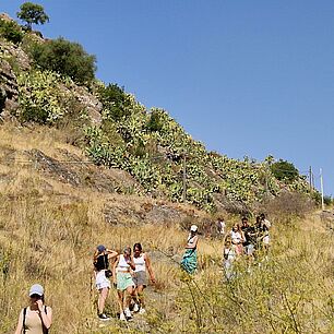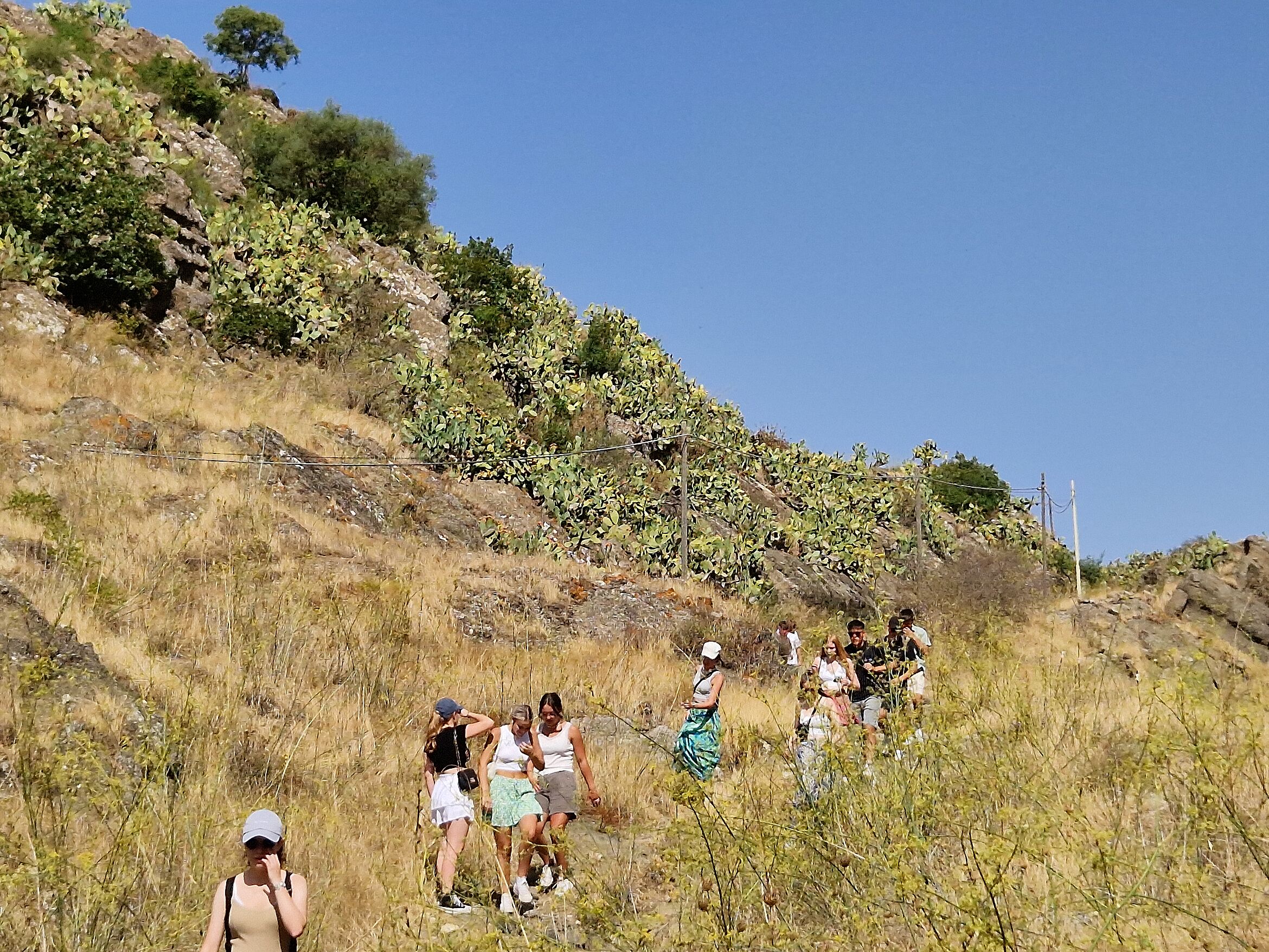Sonntag, 26.279 Schritte: Nachdem wir mit dem Zug in der Nähe der Geisterstadt Cuziria ankommen, stiefeln wir bei prallem Sonnenschein zu der auf einem Hügel gelegenen Stadt Vizzini. Dort angekommen sorgen wir nach einer Stadtbesichtigung für unser leibliches Wohl und runden den Wandertag mit einem Besuch des lokalen Fußballvereins ab. Auf dem Rückweg wird selbstverständlich dann auch noch die Geisterstadt erkundet. Der schreckhafte Herr Durschang wird von den Schülern ununterbrochen auf Trapp gehalten. Begleitet werden wir stets von unserem treuen Vierbeiner Bruno und italienischen Rollerfahren, die ein Auge auf die weiblichen Teilnehmer geworfen haben.