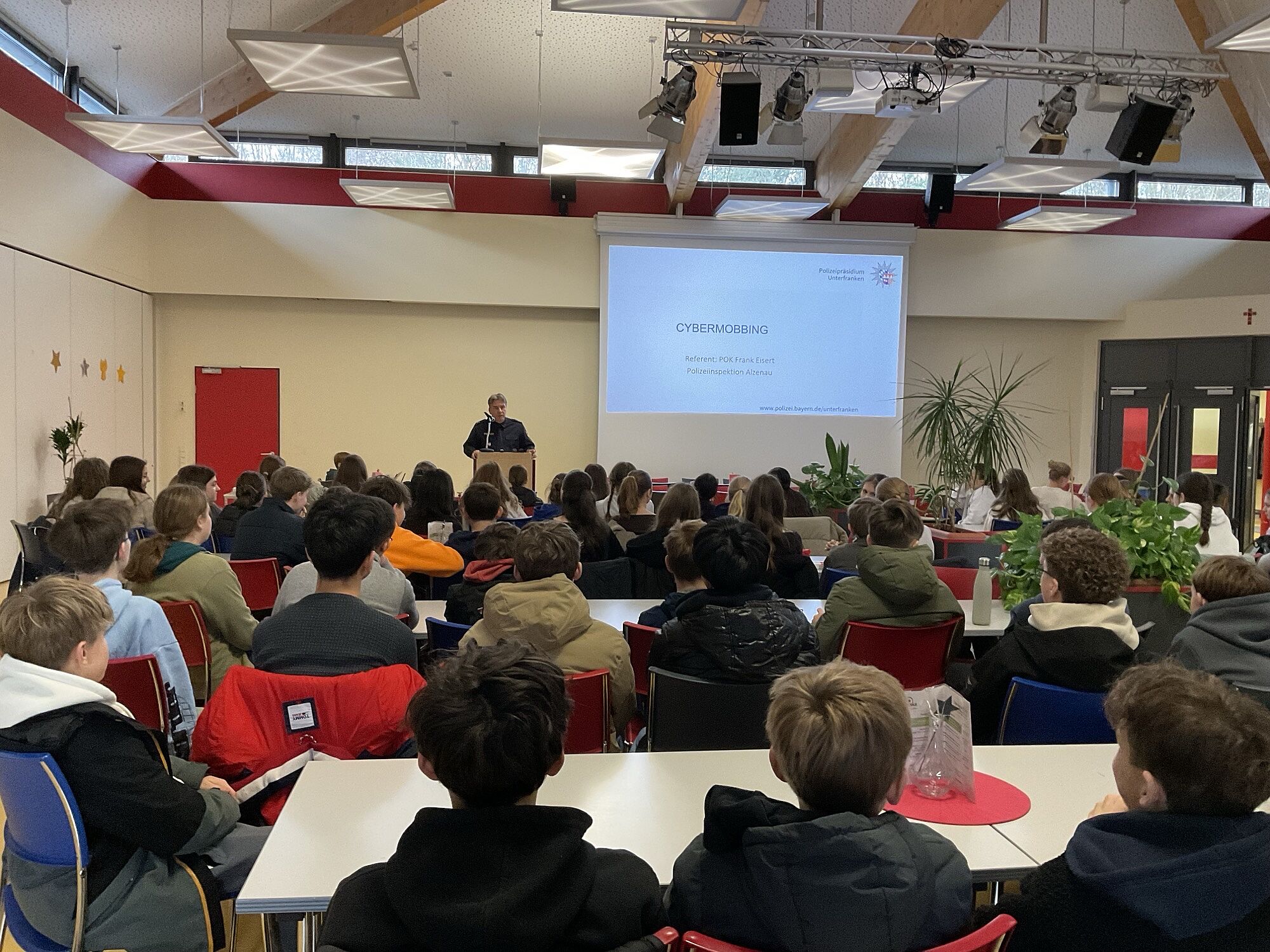 Die Nutzung digitaler Medien stellt für uns alle eine Selbstverständlichkeit dar. Leider gilt dies nicht immer im Hinblick auf einen sensiblen Umgang mit digitalen Datenträgern – etwa Bildern Dritter. Neben zwischenmenschlichen und schulklasseninternen Verwerfungen kann dies mit dem Erreichen der Strafmündigkeit auch weitreichende unangenehme strafrechtliche Folgen nach sich ziehen. Um die Jugendlichen hinsichtlich der rechtlichen Aspekte zu ,,Cybermobbing“, ,,Recht am eigenen Bild“, ,,Besitz und Verbreitung von (Jugend-) gefährdenden Inhalten“ zu informieren, ist Herr Polizeihauptmeister Eisert in seiner Eigenschaft als Schul- und Präventionsbeamter der Polizeiinspektion Alzenau im Rahmen eines Vortrags für die Schülerinnen und Schüler der 8. Jahrgangsstufe am Donnerstag, 18.12.2025 in der Mensa des Spessart-Gymnasiums Alzenau auf die wichtigsten zu beachtenden Aspekte eingegangen. Zu dieser Schulveranstaltung waren selbstverständlich auch die Eltern eingeladen. Im Namen der gesamten Schulfamilie dankte OStD Carlo Ribeca Herrn Polizeihauptmeister Eisert ganz herzlich für den hervorragenden Vortrag!
