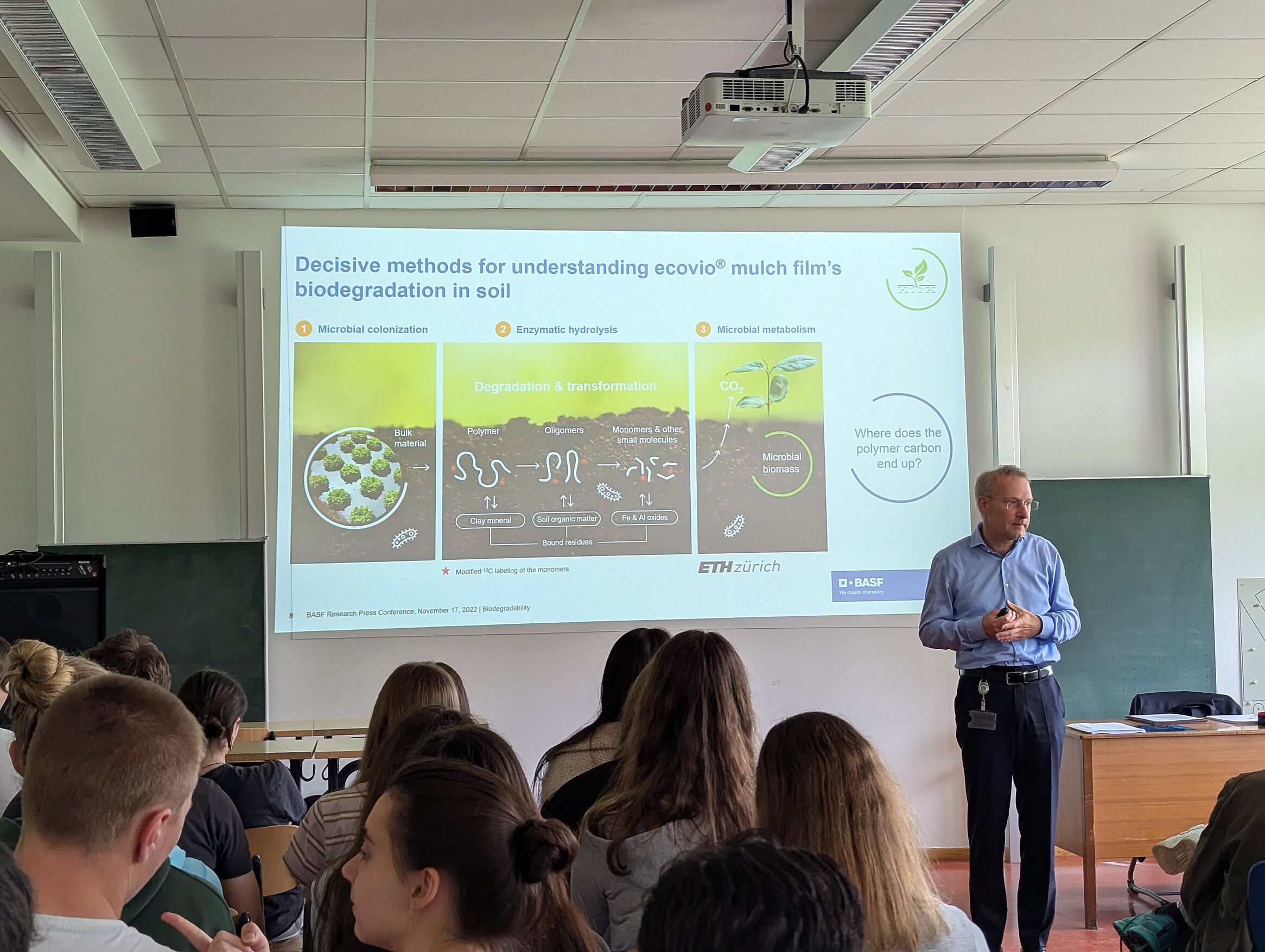 Zuerst gab Prof. Künkel eine thematischen Einführung in das Thema und einem Einblick in die Forschung und den Zertifizierungsprozess von biologisch abbaubaren Kunststoffen. Er zeigte dabei auf, für welche Plastikprodukte überhaupt ein Ersatz durch Biopolymere sinnvoll ist, und welche Schritte zur wirtschaftlichen und politischen Akzeptanz notwendig sind.