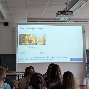 Dabei wurden Fragen zum Plastikverbrauch in Deutschland, aber auch im Vergleich dazu in anderen Ländern der Welt beleuchtet. So wollten die Schüler bspw. wissen was überhaupt abbaubar bedeutet – und in welcher Zeitspanne, oder was ein großer Chemiekonzern zur Reduzierung des Plastikmülls auf der Welt beiträgt oder wie ganz konkret ein Biopolymer aufgebaut sein muss.