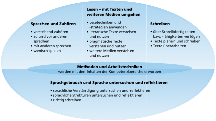 Der Lehrplan für das Fach Deutsch ist in allen Jahrgangsstufen gegliedert nach fünf Bereichen, die progressiv weiterentwickelt werden. Diese sind im Einzelnen: