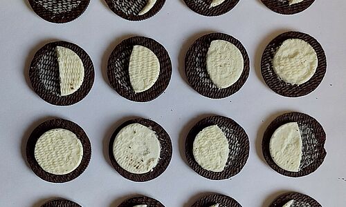 Bevor man dunkle Doppelkekse mit heller Füllung verzehrt, kann man sie wissenschaftlich nutzen, um die Mondphasen darzustellen.